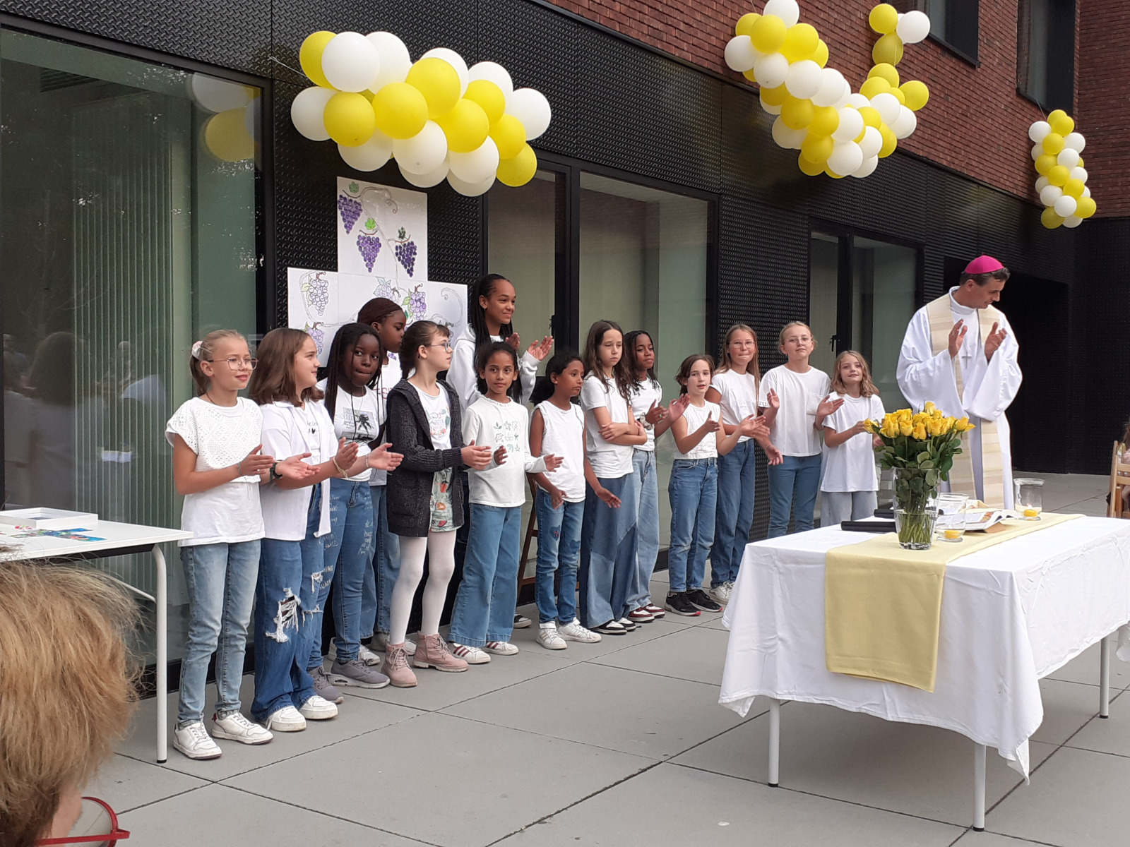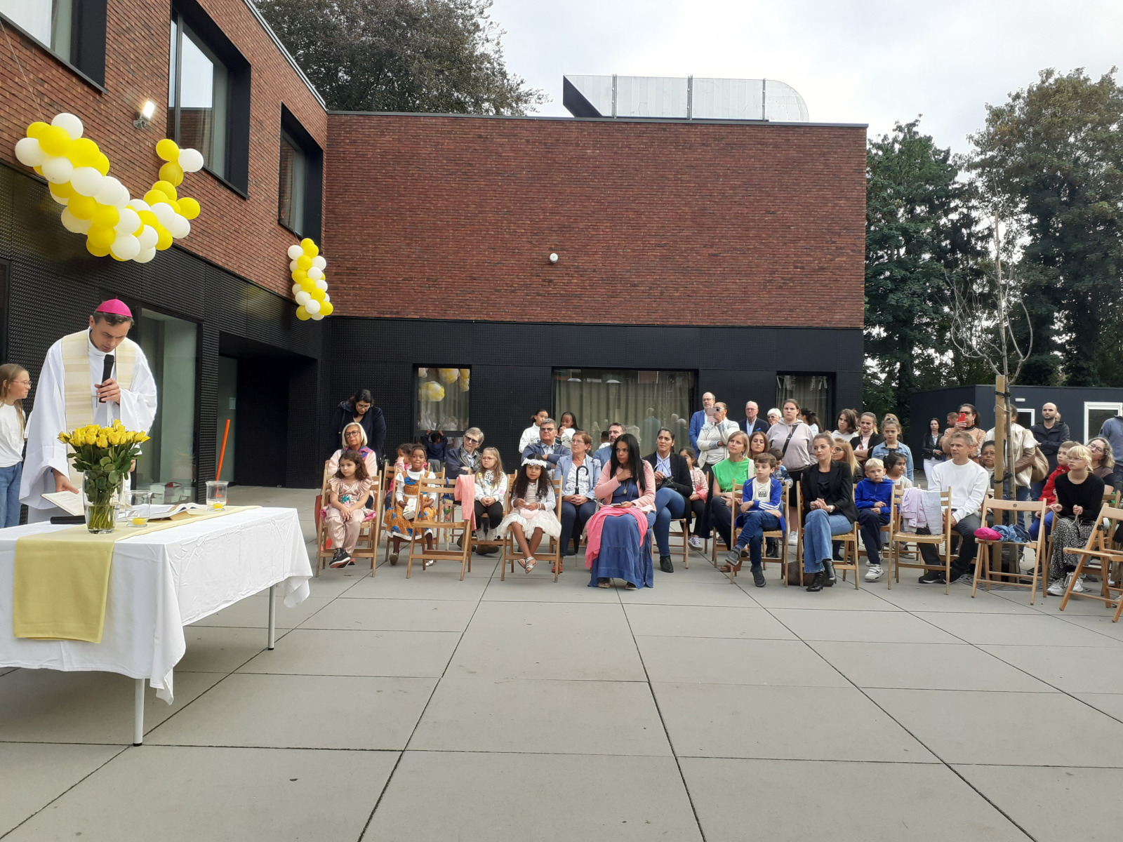 Le vendredi 29 septembre, pour marquer l’inauguration du nouveau bâtiment, Monseigneur TERLINDEN a gracieusement accepté de se joindre à nous. Ce fut une occasion solennelle où il a béni les locaux ainsi que les croix spécialement confectionnées par les enfants. Notre archevêque a plaidé en faveur de la création d’une école fondée sur les valeurs de l’amitié, du respect mutuel et de la gratitude.