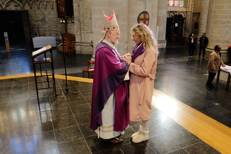 Les premiers rangs de la cathédrale se remplissent des catéchumènes qui seront appelés au Baptême, aux côtés de leur accompagnateurs. Une année record avec près de nonante candidats adultes au Baptême, un “groupe” intergénérationnel comptant même une personne de plus de quatre-vingt ans ! Pendant que tout le monde s’installe, l’équipe du catéchuménat s’affaire pour régler les derniers préparatifs. L’équipe de chant liturgique s’échauffe sous la baguette de Béatrice Sepulchre. La célébration peut alors débuter !