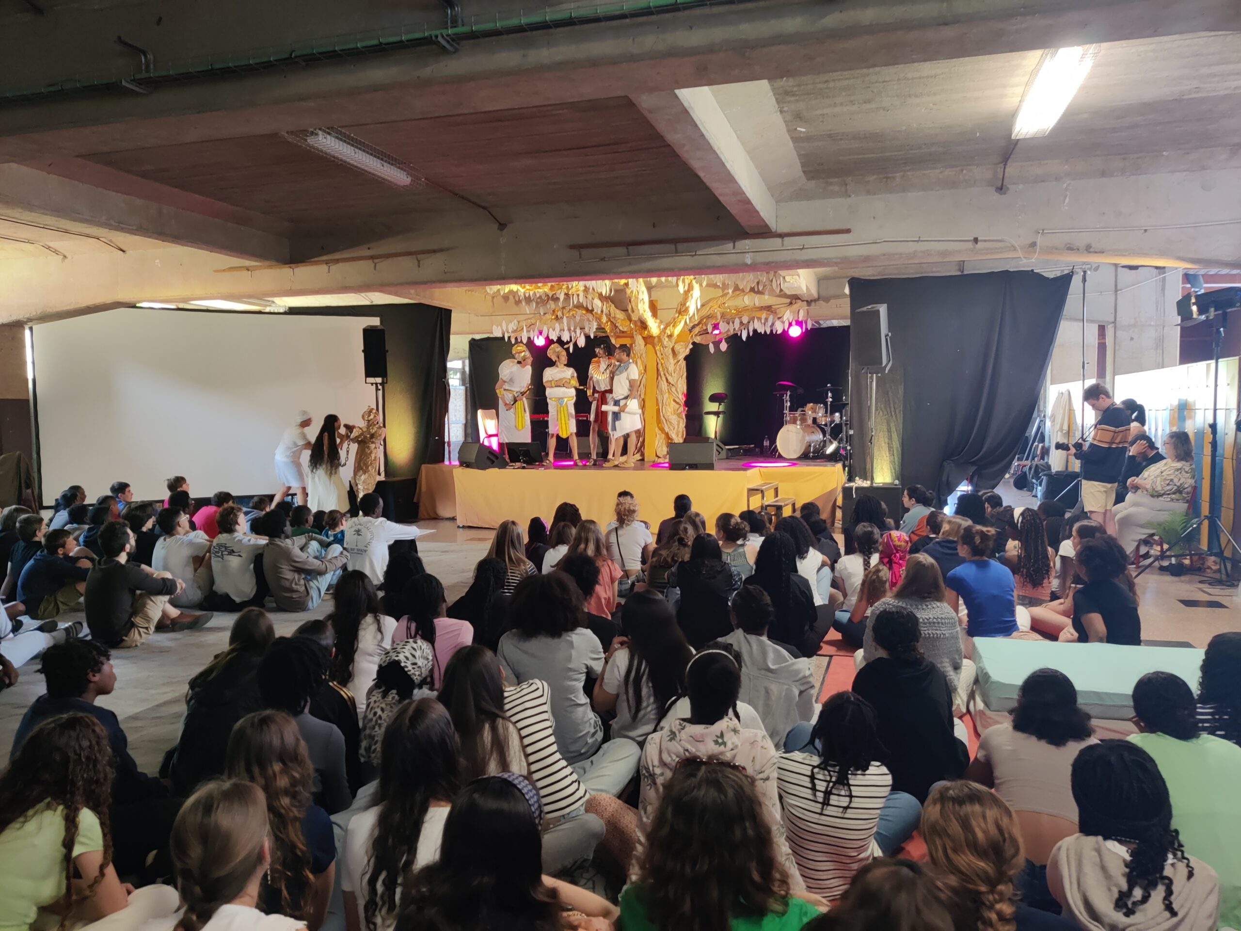 Les adolescents assistent à la pièce de théâtre sur la vie de Moïse, mise en scène par les animateurs du camp.