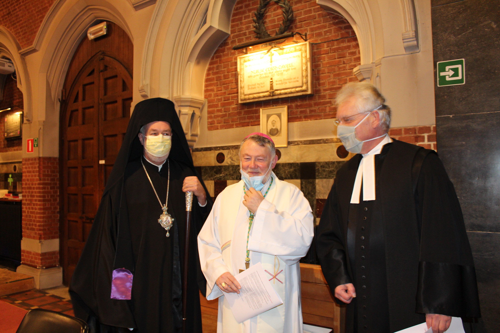 Point d’orgue de cette semaine de prière, hier a eu lieu la célébration réunissant son éminence, le métropolite Athénagoras de Belgique, le président de l’Eglise Protestante Unie de Belgique (EPUB), le pasteur Steven Fuite ainsi que mgr Kockerols. Ils ont été accueillis par le chanoine John Wilkinson et le chanoine Jack McDonald de la pro-cathédrale anglicane Holy Trinity à Ixelles. On a relevé la présence de nombreux autres chefs de culte dans l’assistance ainsi que celle de mgr Coppola, le nouveau nonce en poste depuis dimanche dernier.