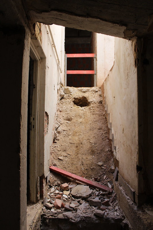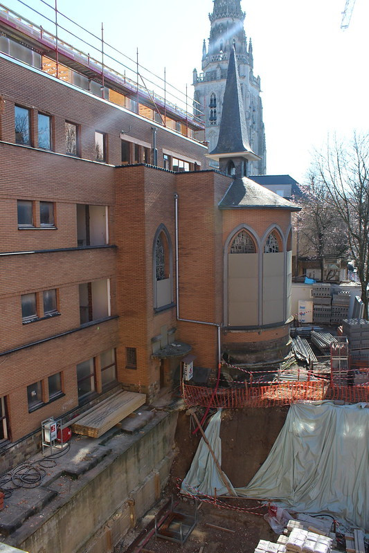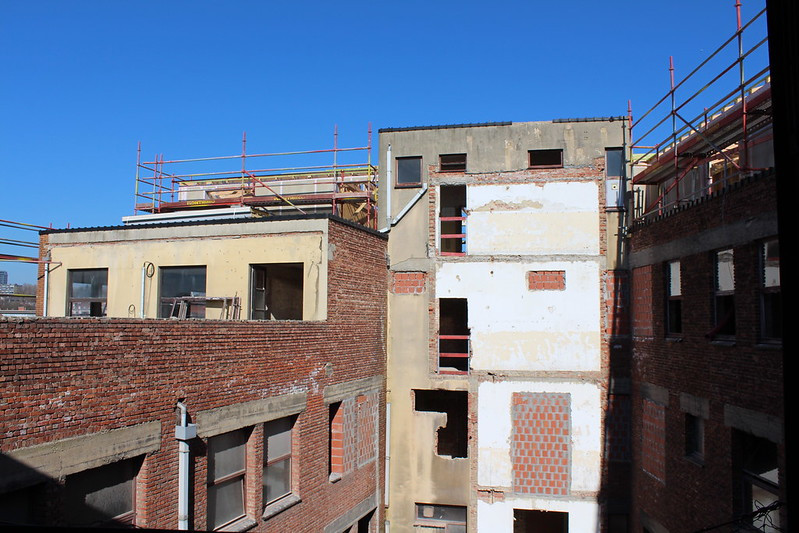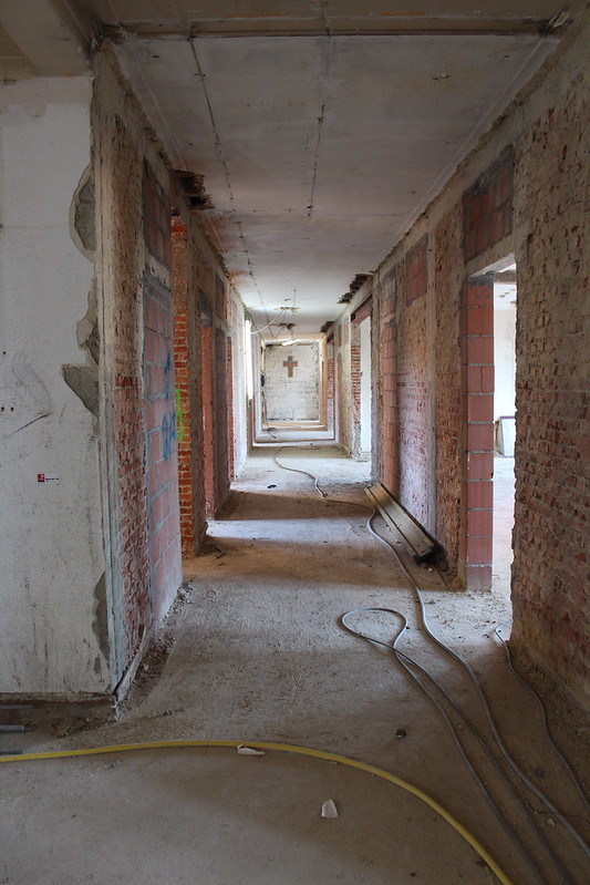 Les 10 000m2 du Centre Rafaël subissent une rénovation majeure qui permettra de professionnaliser l’offre caritative qui y sera proposée. Les étages supérieurs ont déjà leurs structures futures pour leur conversion en appartements. Le toit de l’ancienne salle de gym a été remplacé par une charpente en bois tandis que les ouvertures dans les murs ont été percées ou rebouchées pour se conformer aux besoins à venir. L’ancien jardin a été creusé si bien que le niveau actuel sur cette zone est un étage plus bas que précédemment. Les travaux des étages dédiés aux services de ce véritable « village social » (-1, rdc et 1) intègrent eux les desiratas des futurs asbl à visée sociale qui vont y développer leurs activités. Au milieu de ce tumulte, la chapelle fermée au public est la seule entité qui reste dans son état d’origine.