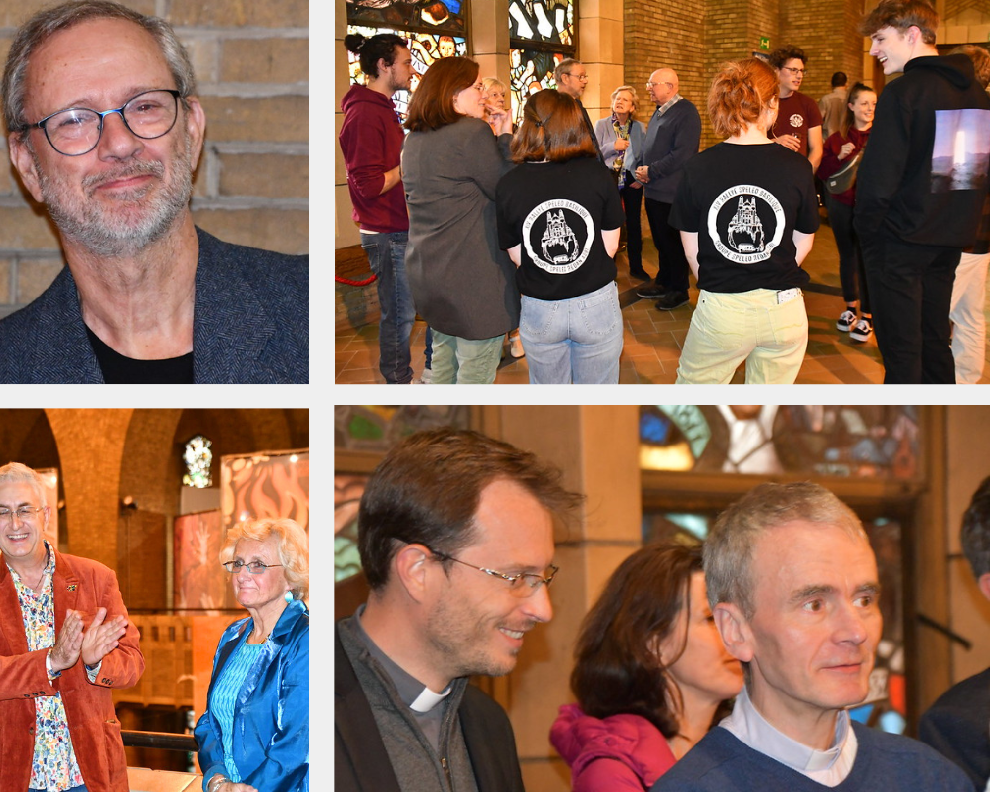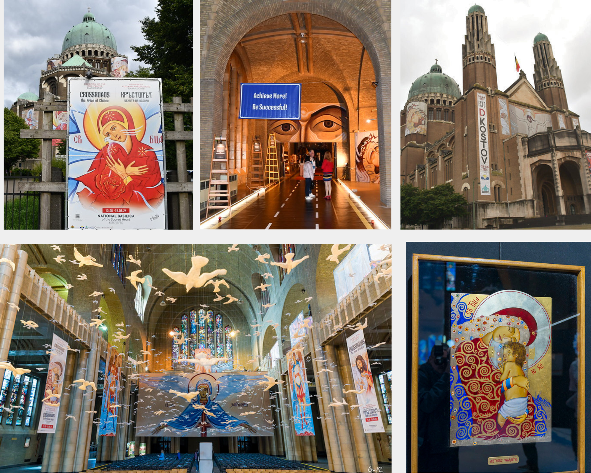 L’écrivain d’icônes bulgare, Dian Kostov, et son équipe ont été à l’œuvre depuis avril pour préparer et installer l’exposition monumentale de ses œuvres dans la basilique nationale du Sacré-Coeur de Koekelberg. Il a fallu le concours de nombre d’acteurs réguliers du terrain comme Martine Motteux, la directrice générale du bâtiment mais aussi celui exceptionnel d’un club de spéléologues pour suspendre en hauteur les toiles géantes. Non seulement les façades extérieures sont pavoisées mais aussi l’intégralité de la nef où s’envolent des milliers d’oiseaux, renouvelant pour tous la vision que nous avions de cette église majestueuse.