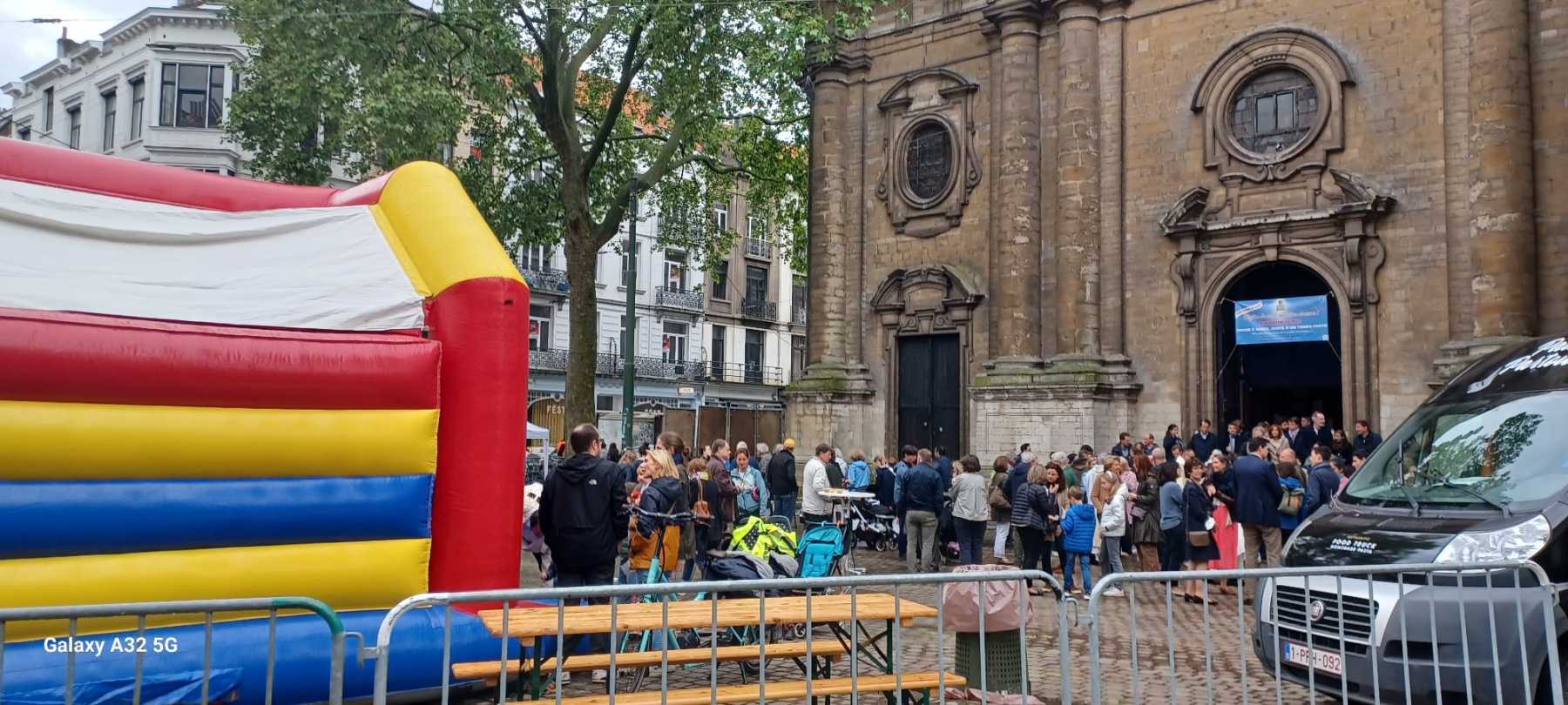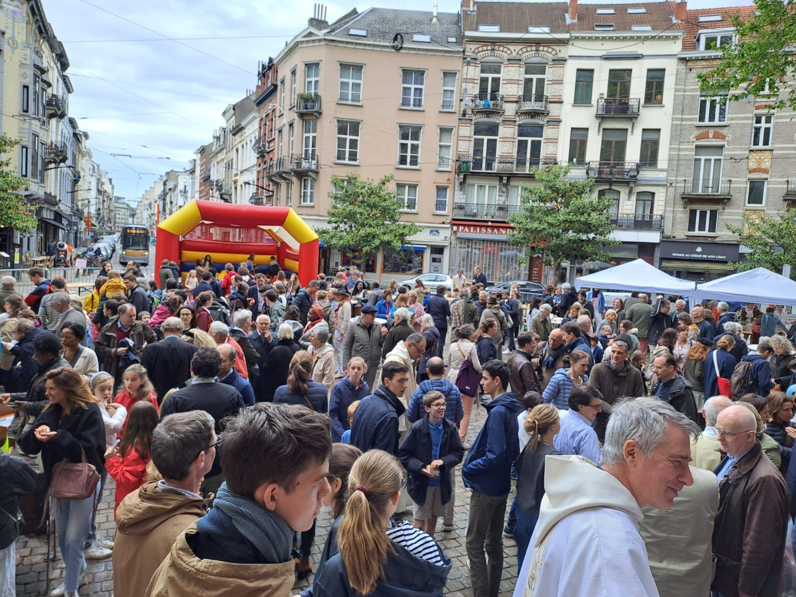 La messe s’est terminée par un petit mot de Charles (cf + bas) et tout le monde s’est retrouvé sur le parvis pour 2h de fête : chateau gonflable pour les enfants, frites, hots dogs, glaces, buvette … tout cela, en échappant à la pluie du jour, terminant même sous quelques rayons de soleil !