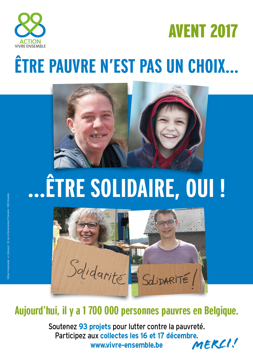 C’est avec le slogan « Etre pauvre n’est pas un choix, être solidaire, oui ! » que l’Avent, Vivre Ensemble vous invite, durant l’Avent, à partir à la rencontre de personnes volontaires au sein d’associations de lutte contre la pauvreté et l’exclusion sociale.