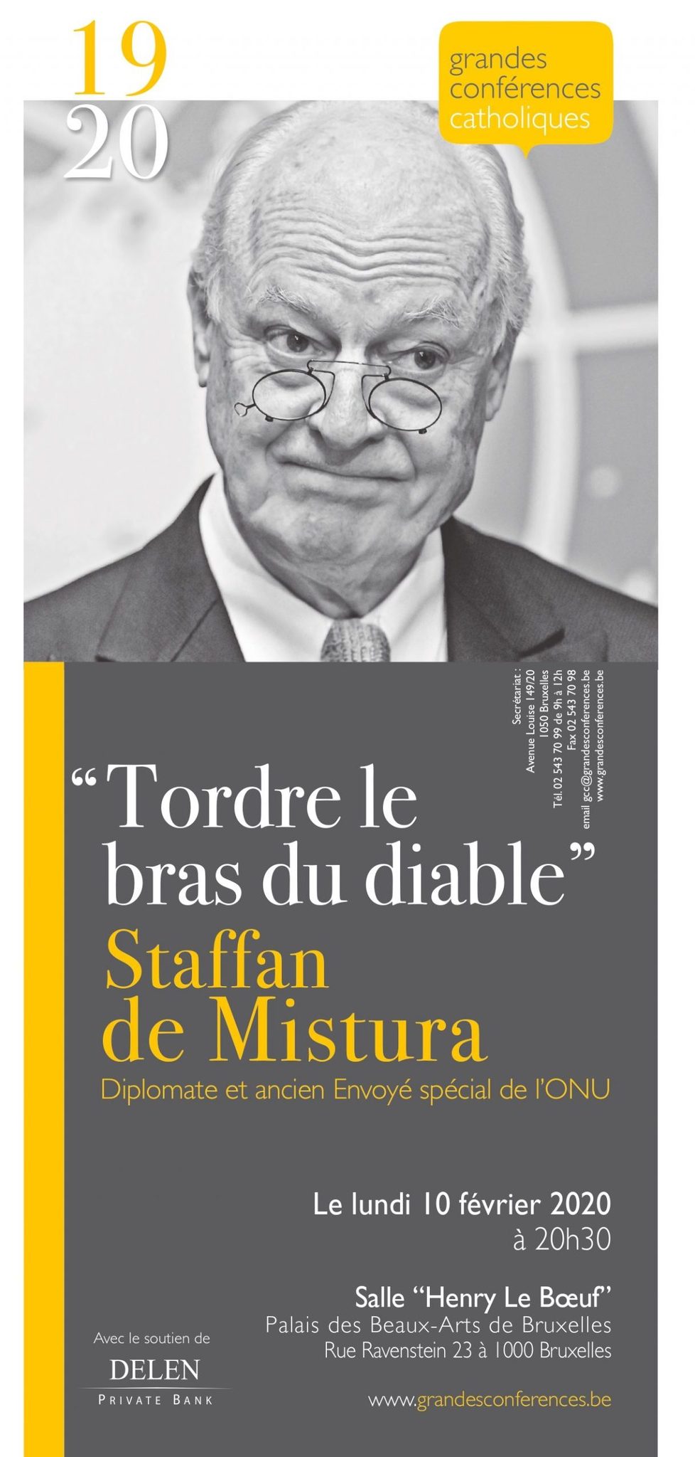 L’ancien ministre des Affaires étrangères de la République italienne, diplomate chevronné d’origine italienne et suédoise, Staffan de Mistura vous invite à sa conférence « Tordre le bras du diable » le 10 février 2020. Il a été l’Envoyé spécial du Secrétaire général des Nationsunies, Ban Ki-moon, en Syrie, en Afghanistan, en Irak et au Liban. En Syrie, il fut chargé par l’ONU de la recherche d’une résolution pacifique de ce conflit, une tâche qui semblait impossible.