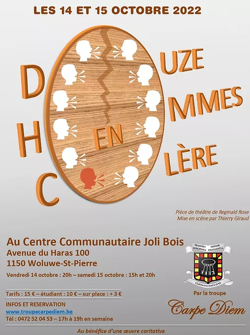Alors, réservez vite vos places pour voir la pièce « Douze Hommes en colère » que la Troupe Carpe Diem vous propose de découvrir.