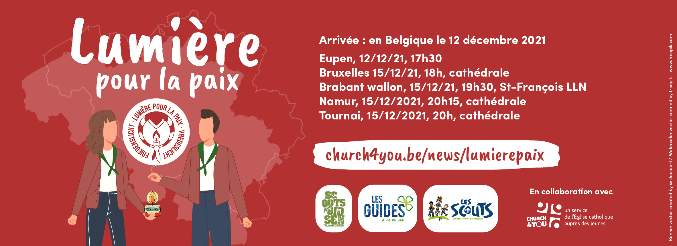 Depuis une trentaine d’années en Belgique, la diffusion de la Lumière pour la paix nous met en route vers Noël. Cette lumière vient directement de la grotte de la Nativité à Bethléem et est apportée par les Scouts & Guides jusqu’à Eupen. C’est un vrai projet fédérateur pour les mouvements de jeunesse et les pastorales des jeunes (Church4you) !