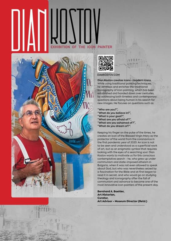 La collaboration avec l’Ambassade de Bulgarie est confirmée et l’artiste Dian Kostov vient avec ses superbes icones à la Basilique Nationale de Koekelberg du 15 juin au 18 août 2024.