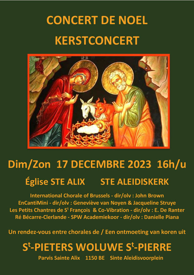 En l’église Ste-Alix à Woluwé-Saint-Pierre, 4 chorales, 2 chorales d’enfants et 2 chorales d’adultes, se produiront le 17 décembre de 16h à 18h30