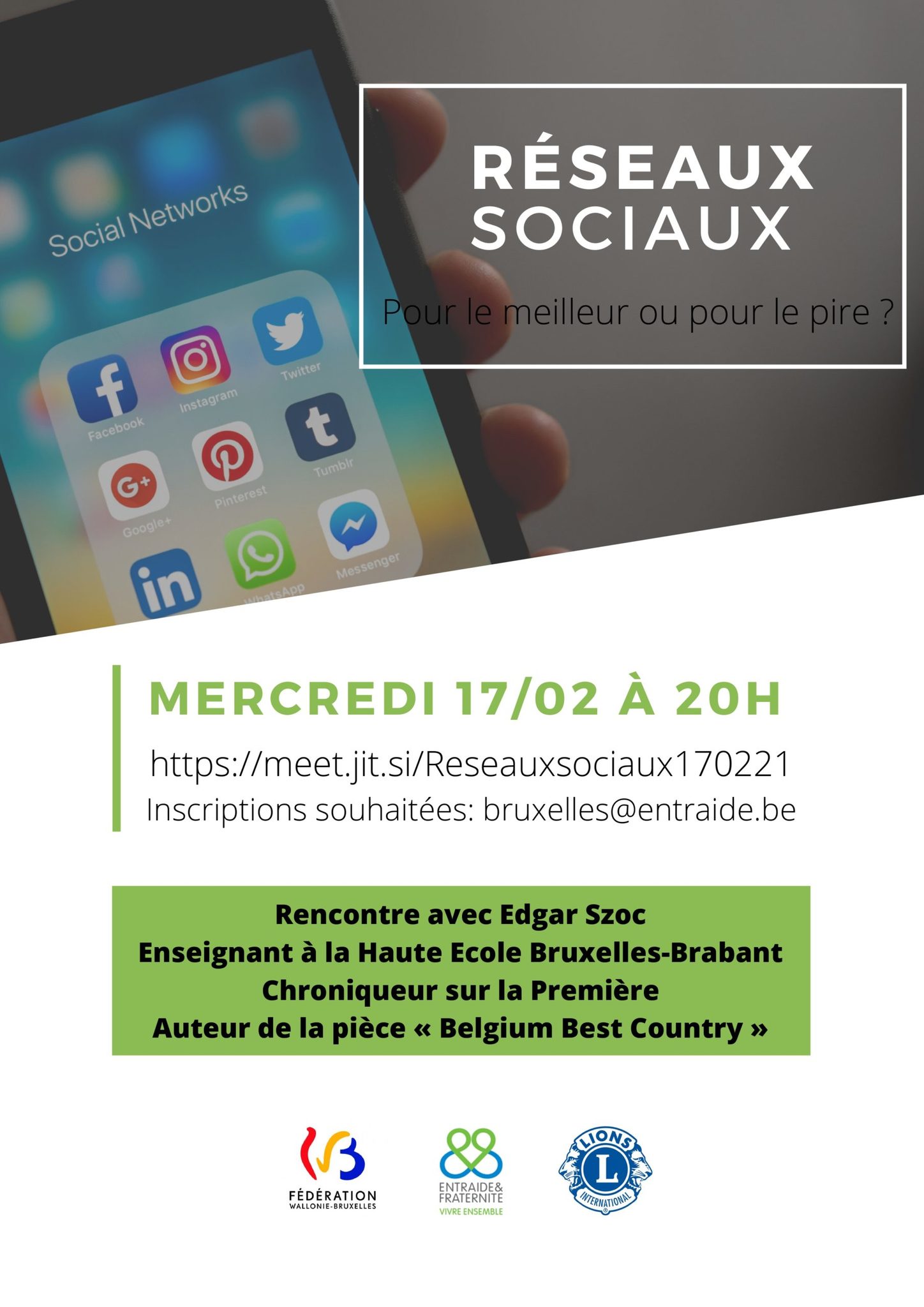 Nous vous invitons à une rencontre avec Edgar Szoc, Enseignant à la Haute Ecole Bruxelles-Brabant, Chroniqueur sur la Première et auteur de la pièce « Belgium Best Country » (en mars au Théâtre de Poche si les conditions sanitaires le permettront) le 17 février 2021 à 20h sur le thème : « Réseaux sociaux, pour le meilleur ou pour le pire ? ».