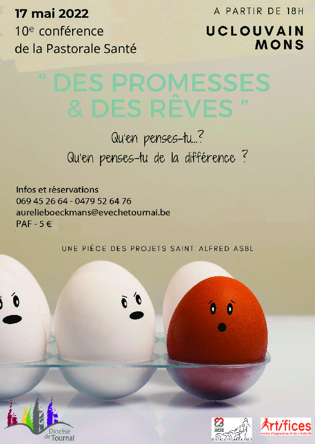 Le Service Pastoral de la Santé du diocèse de Tournai est heureux de vous annoncer que la conférence-spectacle « Des Promesses et des rêves – Qu’en penses-tu… qu’en penses-tu de la différence ? », initialement programmée en novembre 2021 et malheureusement reportée… est enfin reprogrammée ! Elle aura lieu le mardi 17 mai 2022, à l’UCL Mons.