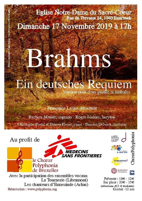 Le Chœur Polyphonia vous invite à venir écouter le Requiem allemand de Brahms dans une version peu courante, celle avec 2 pianos et timbales le dimanche 17 novembre en l’église Notre-Dame-du-Sacré-Coeur d’Etterbeek.