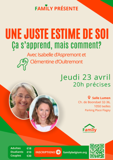 Family Belgium vous invite à venir écouter Isabelle d’Aspremont, Psychopraticienne Monbourquette, accompagnée de Clémentine d’Oultremont, praticienne Monbourquette, le jeudi 23 avril 2026 à 20H à la salle Lumen à Ixelles.