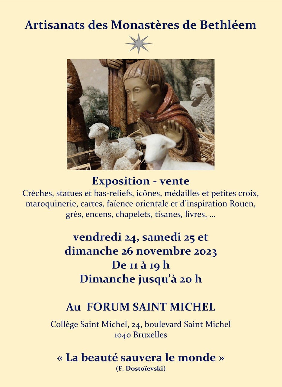 Est-ce que vous appréciez l’artisanat? Il y an une opportunité intéressante pour vous de vous rendre au forum Saint-Michel pour assister à une présentation de l’artisanat des monastères de Bethléem. Il y aura des objets tels que la creche, les statues, les bas-reliefs, les icones, les médailles et les petites croix, ainsi que de la maroquinerie, des cartes chapelets et autres.
