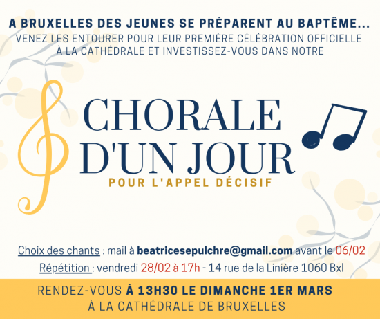 Nous avons besoin de VOUS pour participer à la chorale du jour afin de les entourer dans leur démarche et de leur témoigner de votre foi, jeune et vivante !
