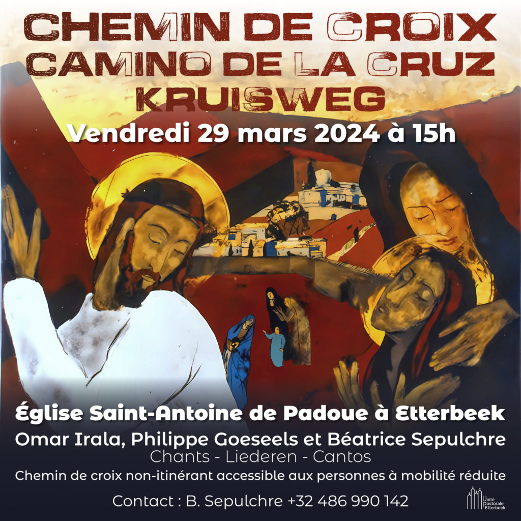 Joignez-vous à nous le vendredi 29 mars à l’église Saint-Antoine à Etterbeek pour un chemin de croix trilingue animé par Amilcar Ferro, Dirk Van Erps, Omar Irala, Philippe Goeseels et moi-même.