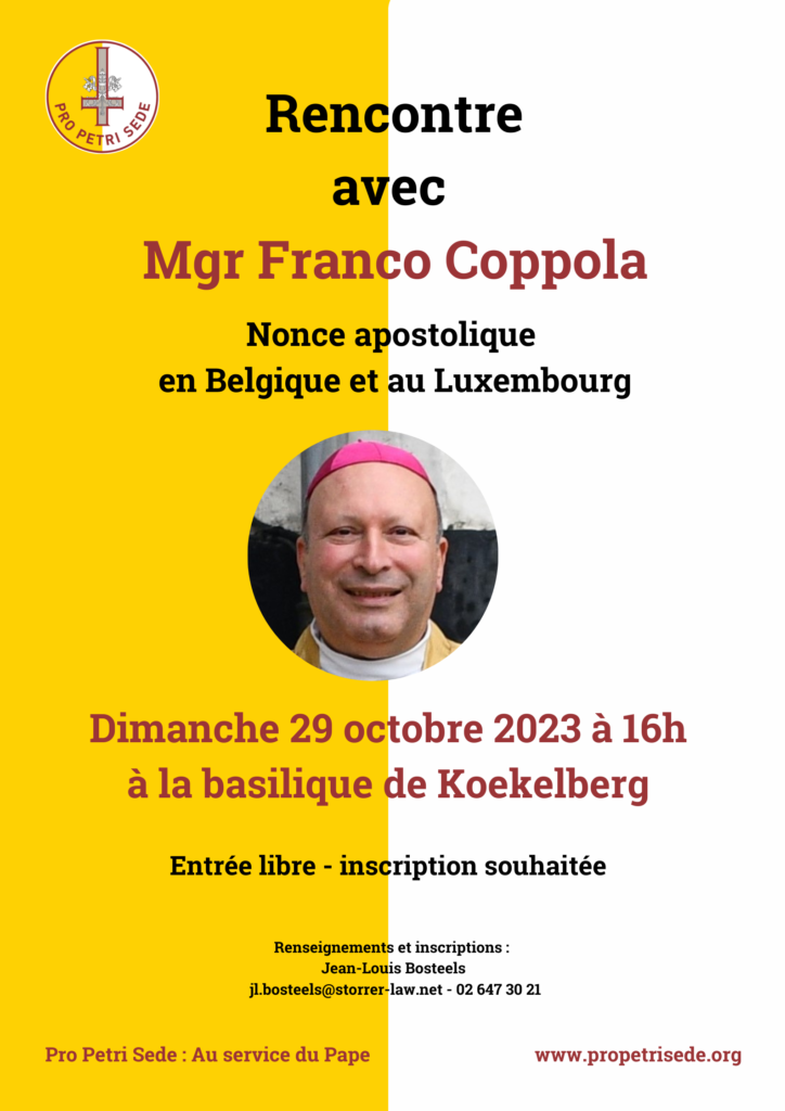 Jean-Louis Bosteels, président des diocèses francophones de l’association Pro Petri Sede et les membres du conseil d’administration ont l’honneur de vous inviter à une Rencontre avec Monseigneur Franco Coppola, Nonce apostolique en Belgique et au Luxembourg