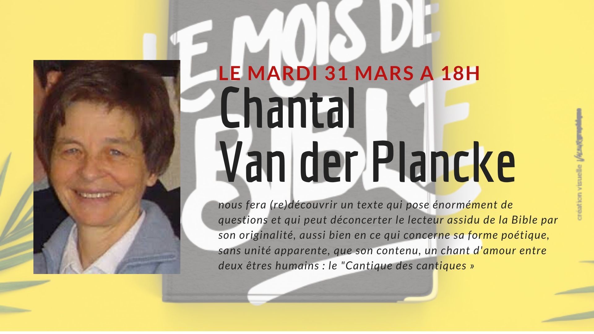 Dans le cadre du Mois de la Bible 2020, nous avons le plaisir de recevoir Chantal Van der Plancke le 31 mars. Elle nous fera (re)découvrir un texte qui pose énormément de questions et qui peut déconcerter le lecteur assidu de la Bible par son originalité, aussi bien en ce qui concerne sa forme poétique, sans unité apparente, que son contenu, un chant d’amour entre deux êtres humains : le « Cantique des cantiques ».
