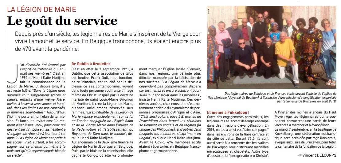 Le mardi 7 septembre, à Koekelberg, messe de commémoration de la Légion de Marie présidée par Mgr Kockerols.