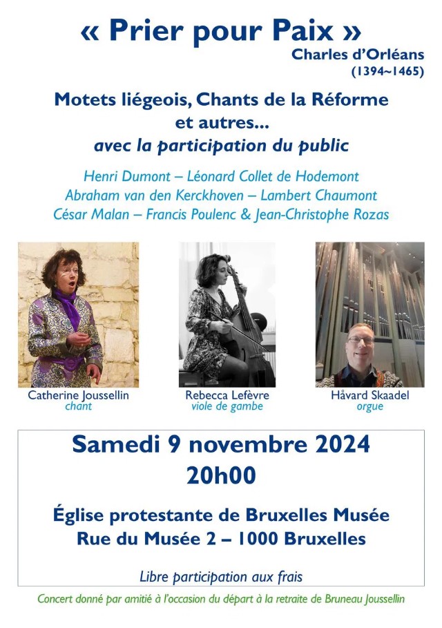 L’église protestante du musée (chapelle royale) vous convie le 9 novembre à 20h à un concert pour la Paix. Cet événement est donné en l’honneur du départ à la pension du pasteur Bruneau Jousselin.