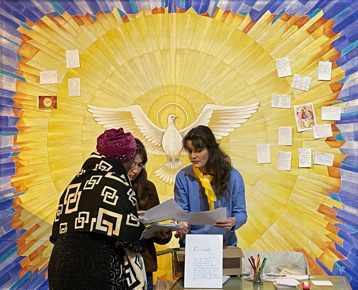 À mi-parcours, les participants pouvaient écrire un ex-voto pour un saint ou pour une personne ayant agi de façon inspirante dans leur vie ; chaque ex-voto était ensuite placé sur une grande fresque en toile spécialement créée pour l’occasion.