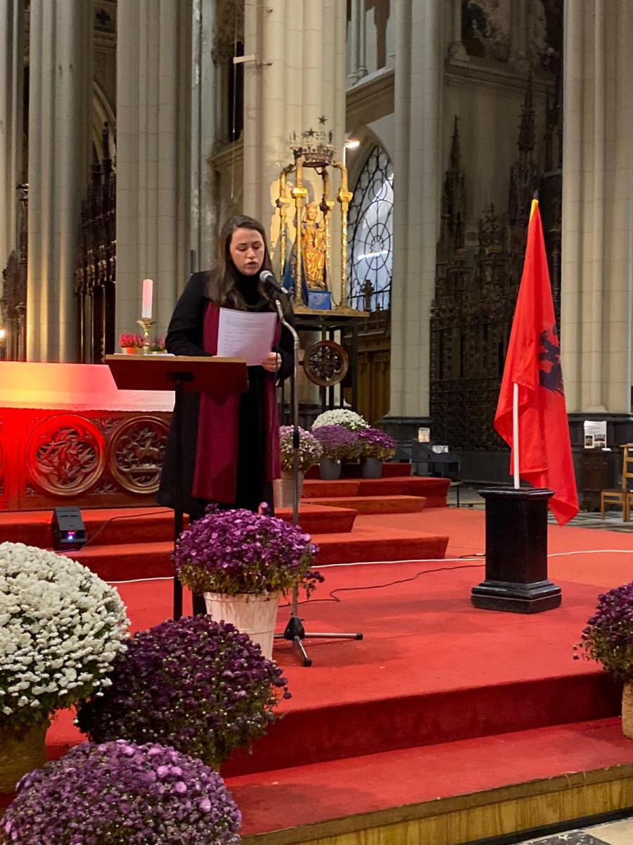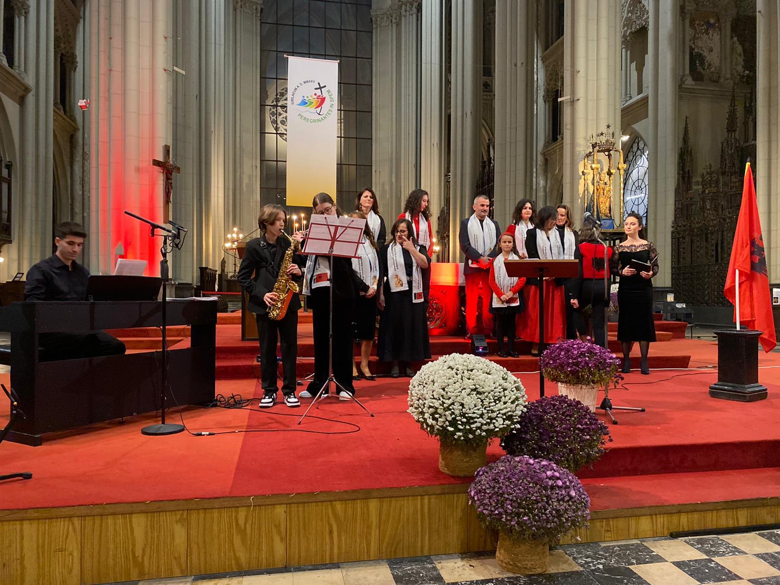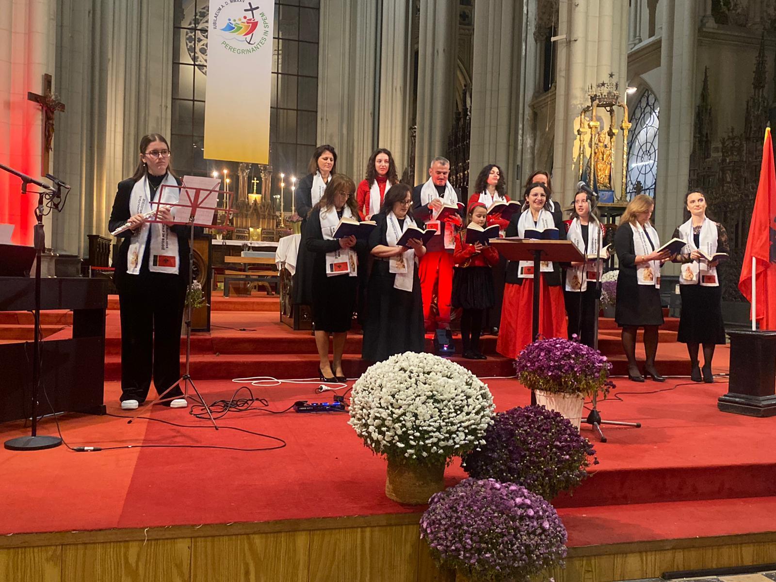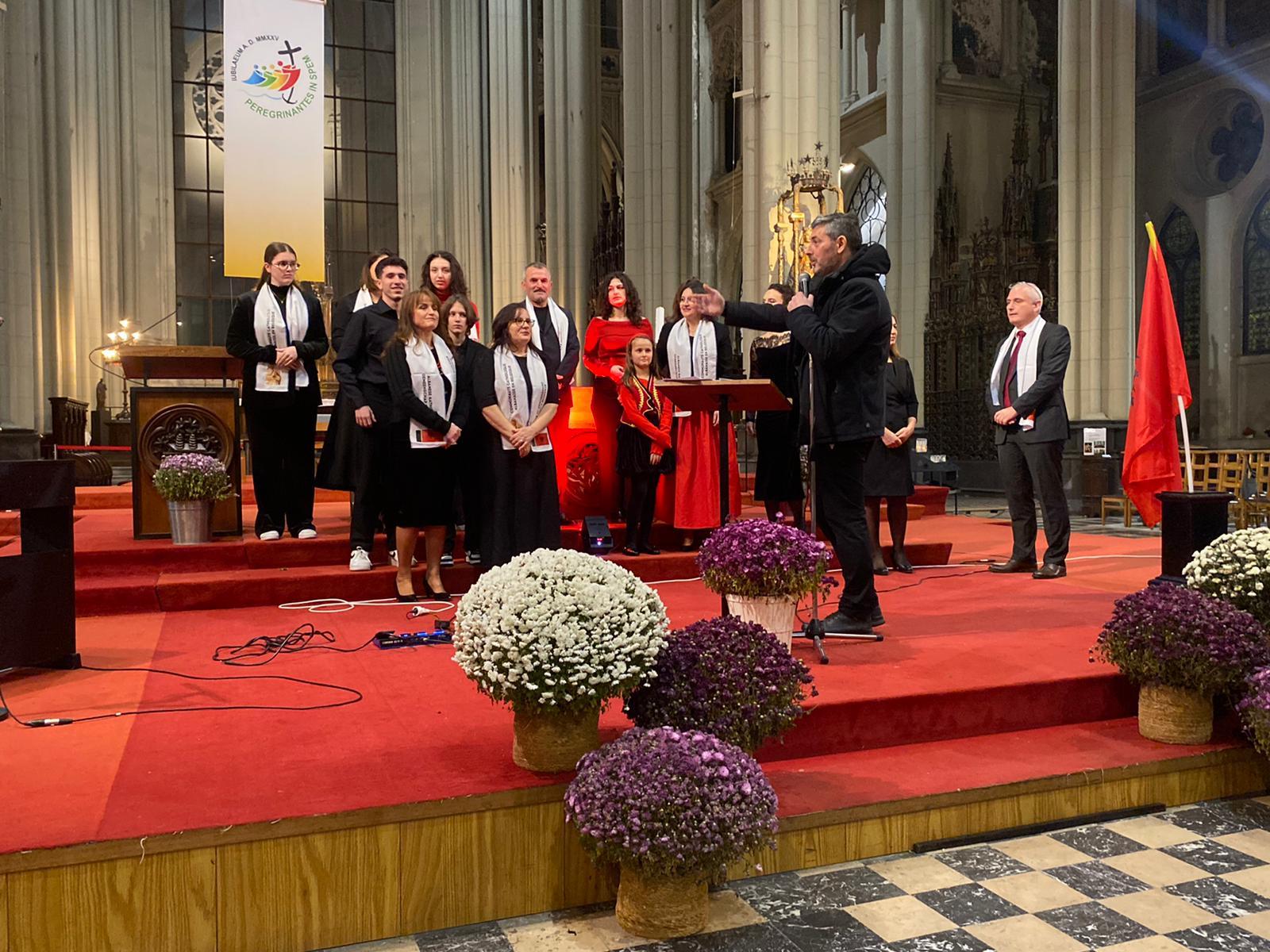 En début et en fin de concert, des jeunes de la communauté albanophone de Bruxelles ont, à leur tour, entonné plusieurs chants, accompagnés au piano, à la flûte et au saxophone, sous la direction de Fran Sokoli, qui anime habituellement les chants lors des messes dominicales. Ils ont notamment chanté un Te Deum repris par l’assemblée, ainsi que leur hymne national.