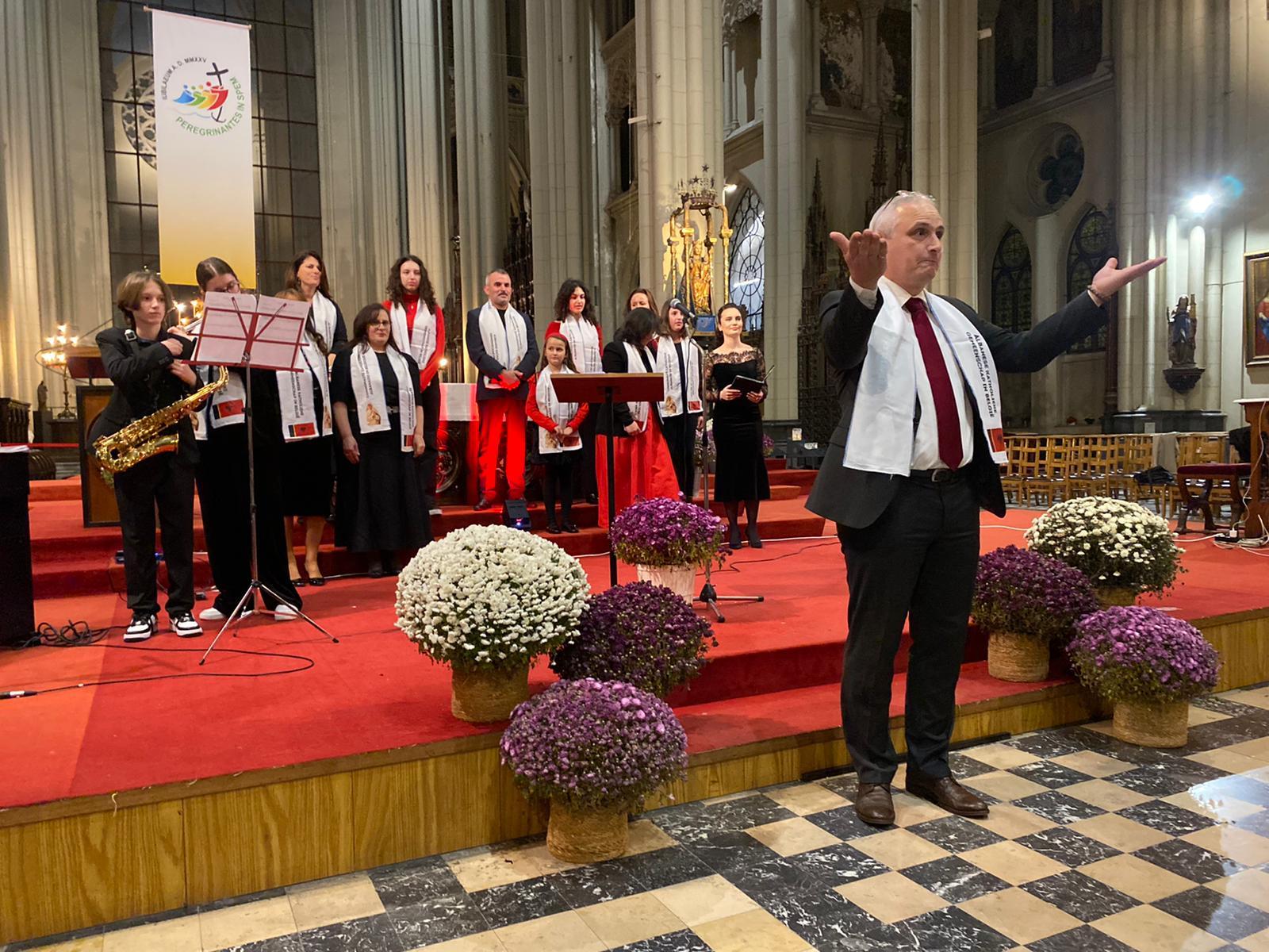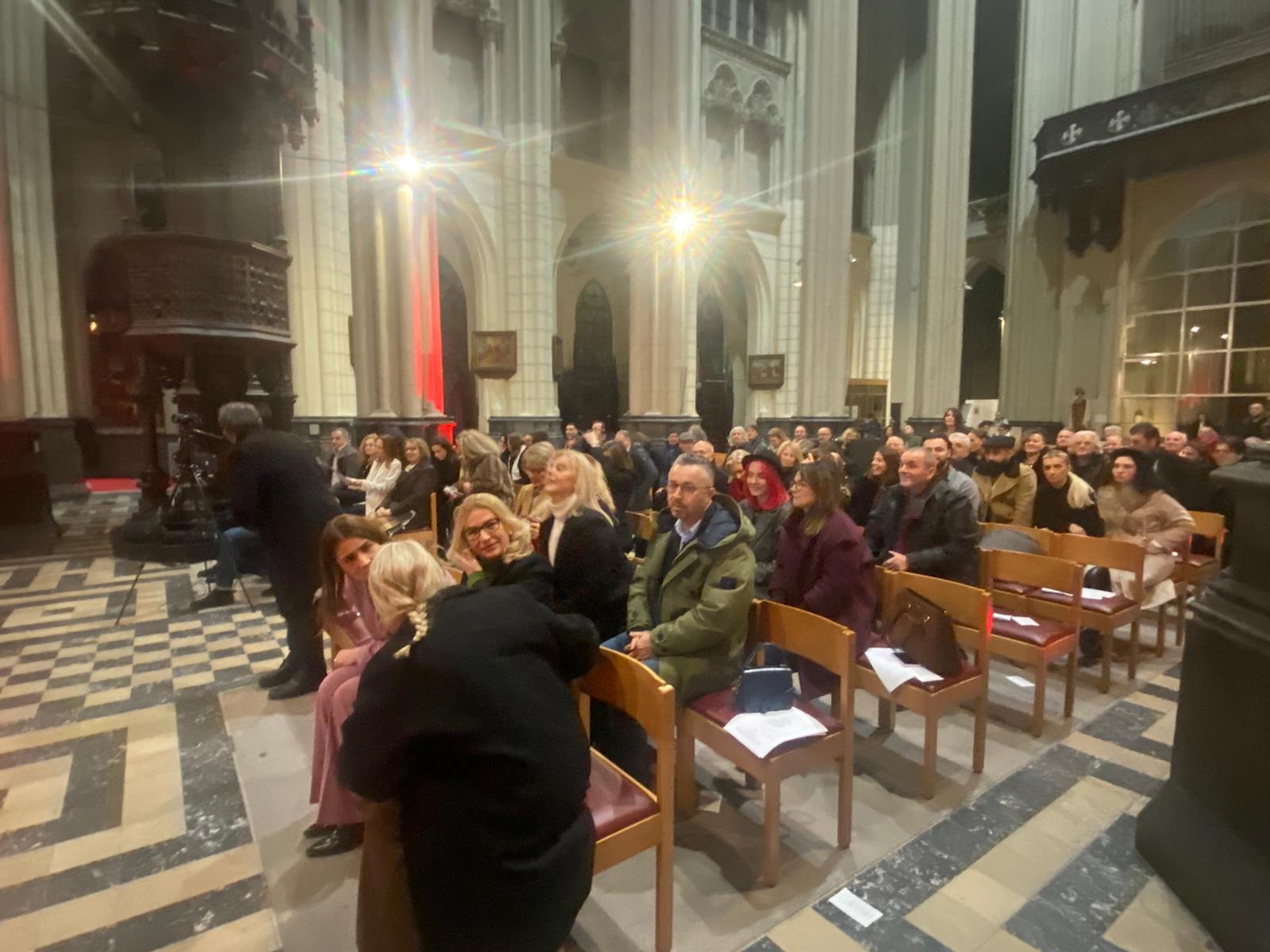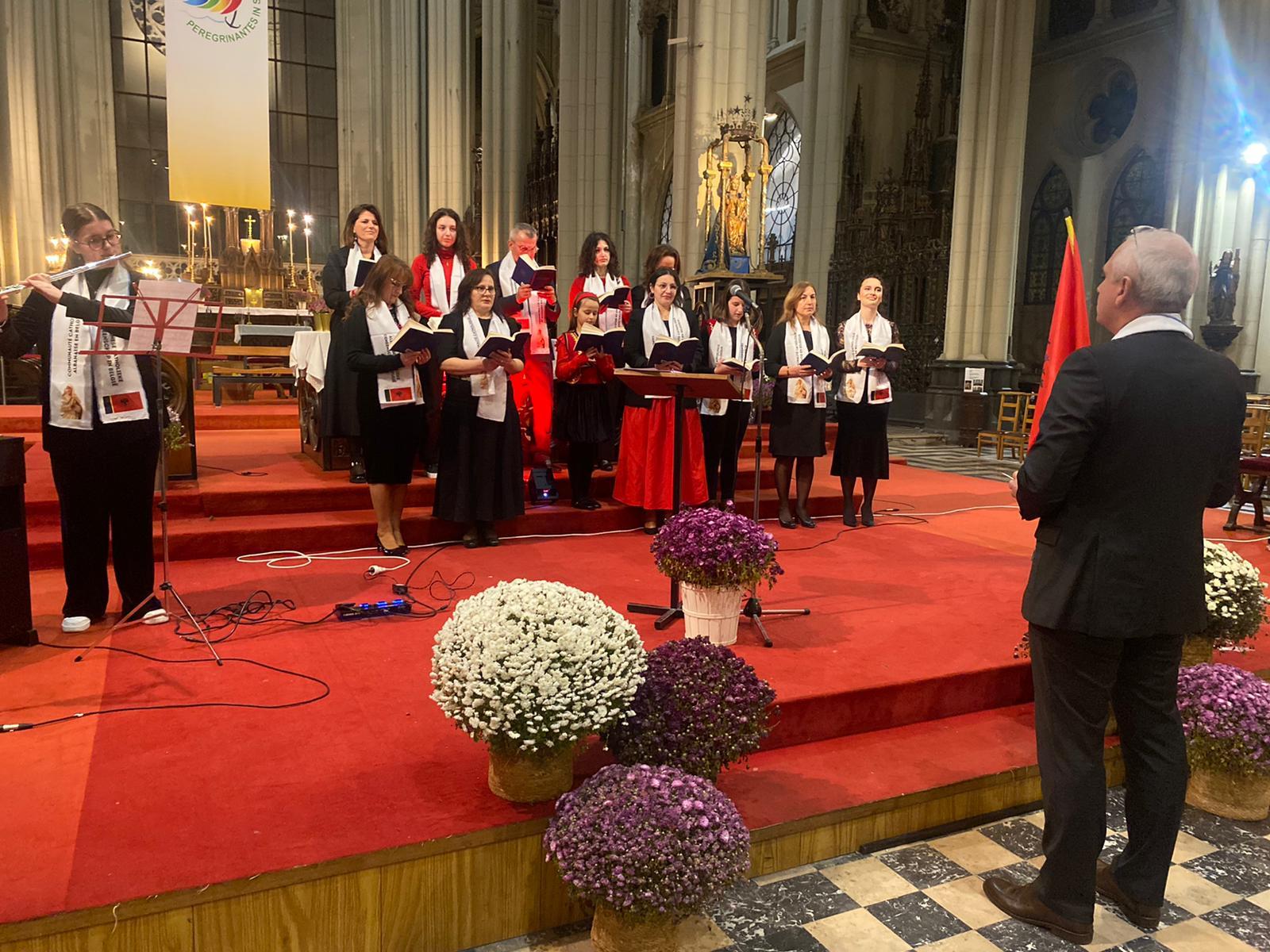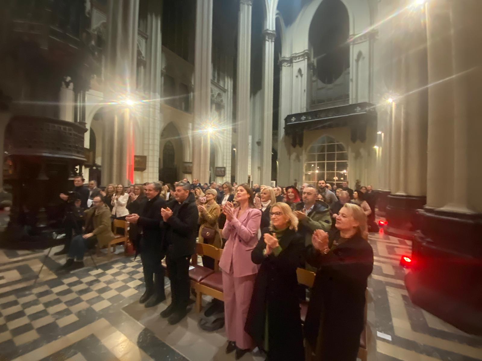Sous le regard de sainte Mère Teresa, patronne de la communauté albanophone de Bruxelles, dont la statue se trouve à côté du chœur, les artistes ont interprété une quinzaine de chants et pièces de musique traditionnels. Le programme comprenait également l’Ave Maria de Franz Schubert ainsi que ceux de JS Bach et Charles Gounod et le Panis Angelicus de César Franck.