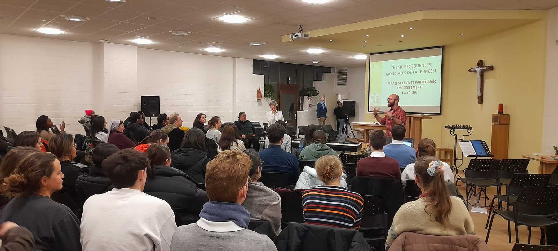 Ce mercredi 8 février, à la chapelle universitaire, centre œcuménique d’Alma, c’était le lancement de la route JMJ-Belge Assomption. Cette soirée regroupait plusieurs lieux d’Église à Bruxelles : UP grain-de-Sénevé, UP d’Etterbeek, Notre-Dame-de-l’Assomption (Woluwe), Basilique de Koekelberg, groupe chaldéen, jeunes syriens de la rue d’Orient et la pastorale universitaire d’Alma qui accueillait. Environ 60 jeunes ont participé, soutenus par des membres de la communauté du dimanche du Centre Œcuménique.