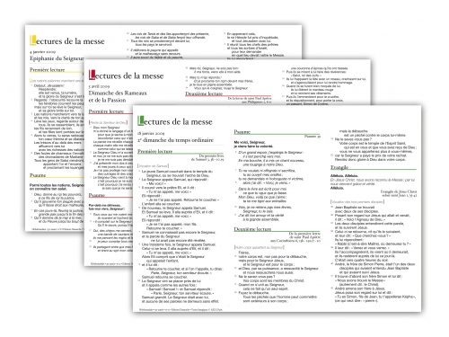 Chaque semaine, les «Lectures de la messe» favorisent l’écoute de la Parole, contribuent au recueillement de vos célébrations et constituent un trait d’union bien utile pour communiquer vos annonces aux paroissiennes et paroissiens.