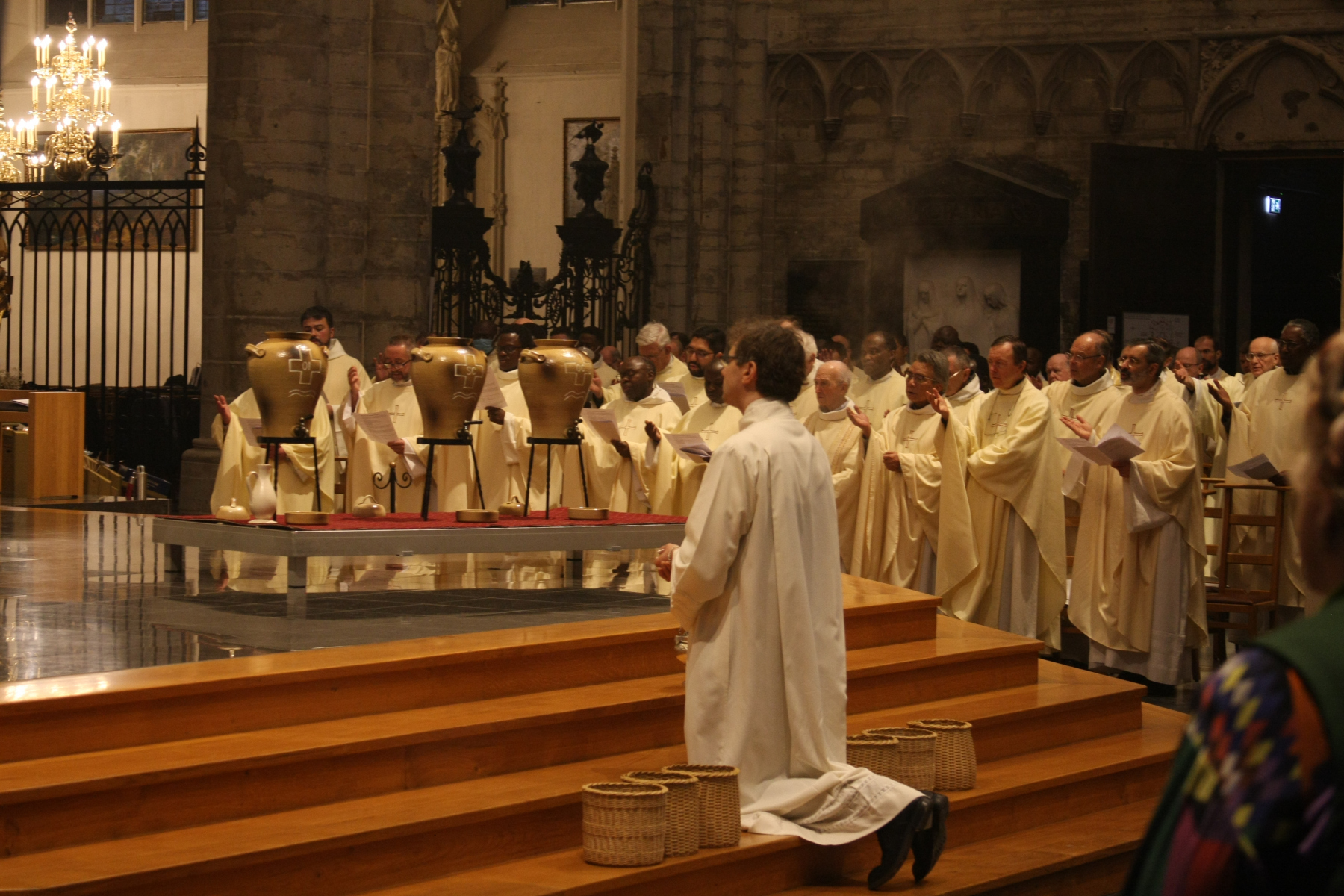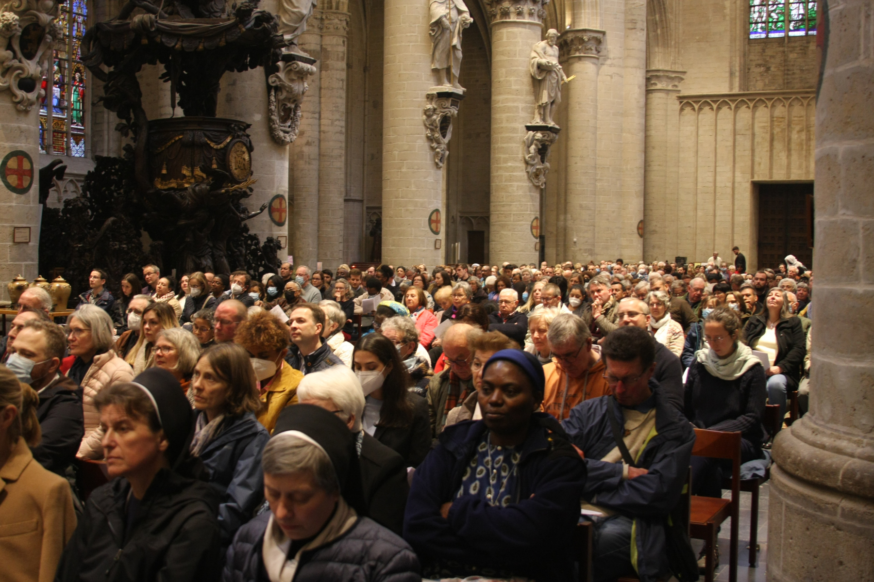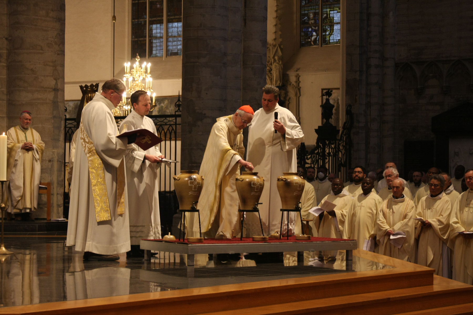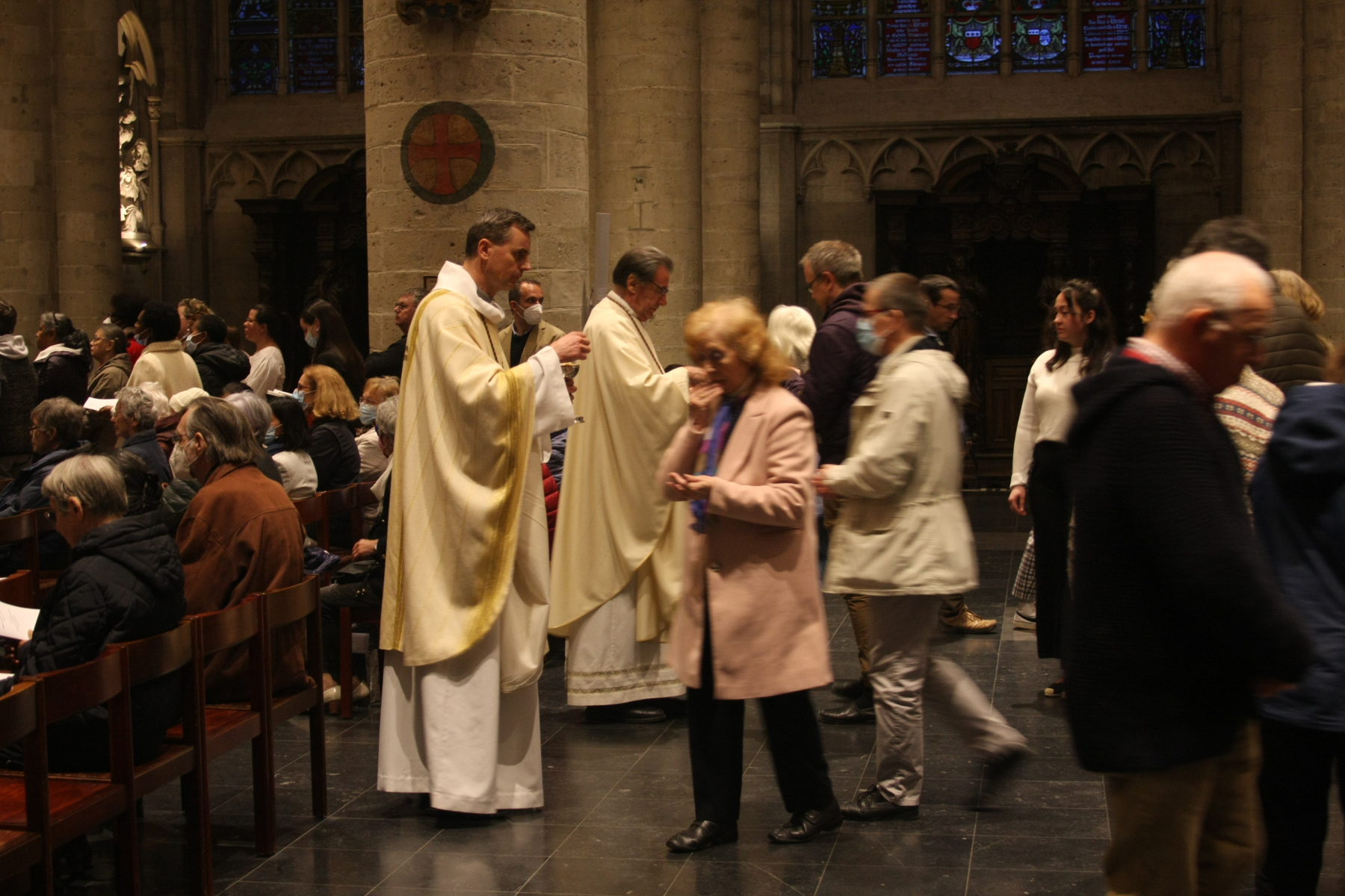 Hier, le 12 avril, le Cardinal Jozef De Kesel a présidé la messe chrismale à la Cathédrale Saints-Michel-et-Gudule de Bruxelles. Il était assisté par mgr Kockerols, évêque auxiliaire de Bruxelles. La cathédrale était comble – certaines personnes étaient debout, faute de place assise – pour accueillir notre évêque titulaire pour la première fois depuis deux ans.