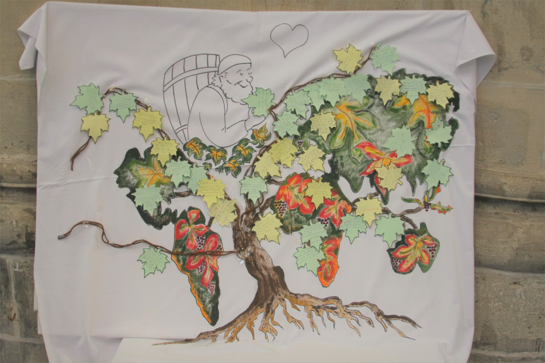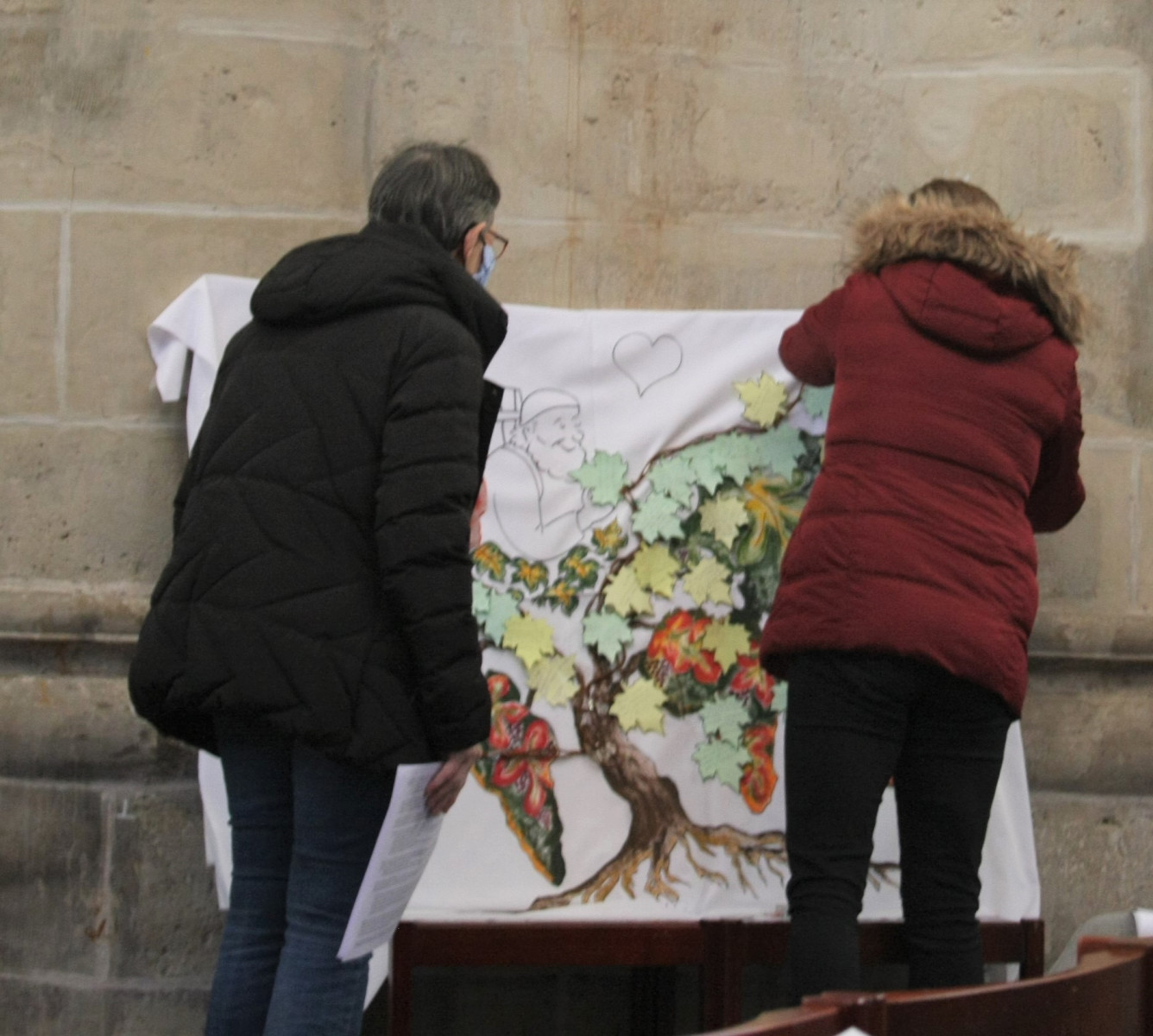 Chaque personne a été invitée à s’installer dans la nef pour méditer un extrait de l’évangile (Jean, 15, 1-7). Avec l’aide de Dominique et Geneviève, elles choisissaient une parole de la Bible qui les avaient marquées, et l’accrochaient sur un papier en forme de feuille sur un panneau figurant la vigne du Seigneur.