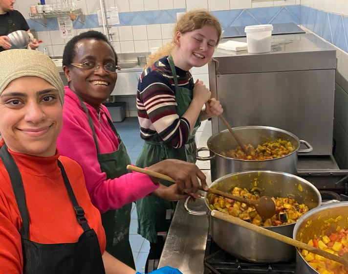 Pour assurer la stabilisation du projet, l’engagement de personnel s’est toutefois avéré nécessaire. Community Kitchen emploie une cheffe cuisinière et deux aide-cuisinières ; le trio forme une bonne équipe car cuisiner demande une implication sans faille, une grande capacité de travail, la capacité à résister au stress en plus des compétences techniques. Le public qui est accueilli avenue du Port, consiste en des réfugiés, des demandeurs d’asile et d’autres personnes en grande précarité.