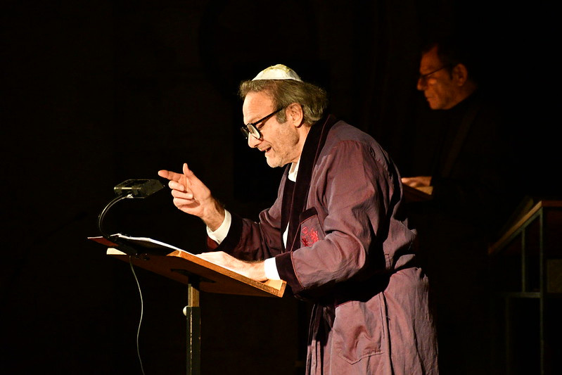 La représentation était suivie d’un débat autour du retrait de Dieu, question récurrente de la pièce : Que penser du silence de Dieu face à la cruauté des hommes, en particulier Auschwitz ? Encadrant le doyen Lobet et l’auteur, Thomas Gergely, directeur de l’Institut d’étude du judaïsme à l’ULB, Bernard Pottier, SJ membre de la Commission théologique internationale du Vatican et Mohamed El Battiui, enseignant à la Haute Ecole Francisco Ferrer ont présenté pour leurs religions respectives comment l’attitude de Dieu pouvait être comprise.