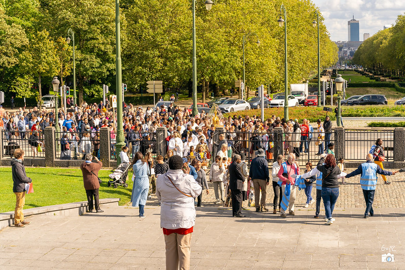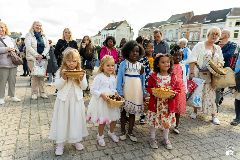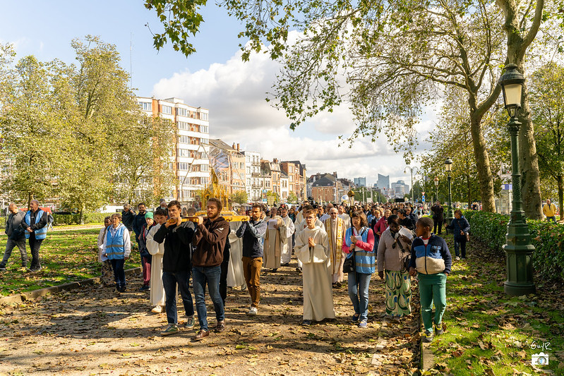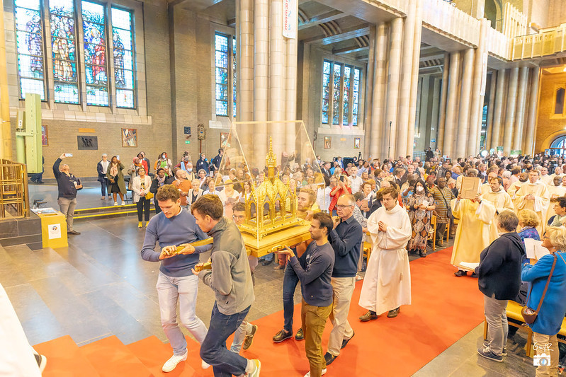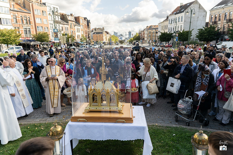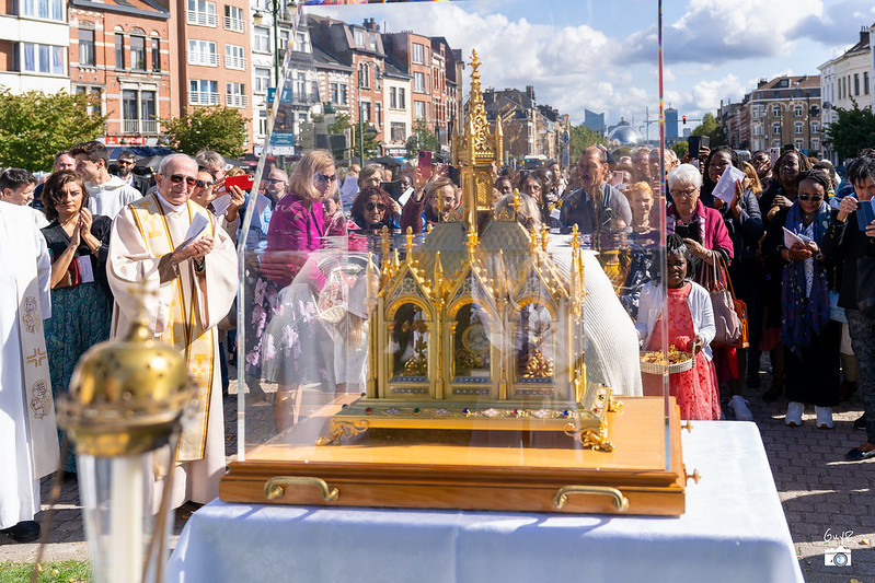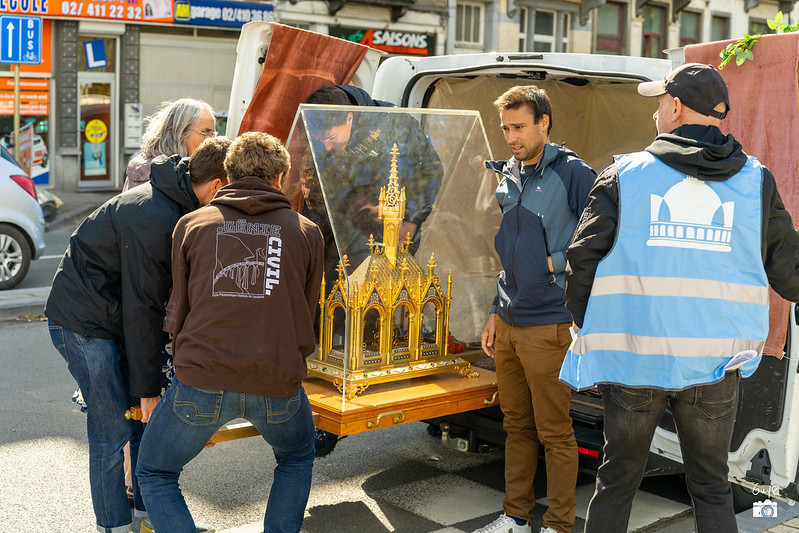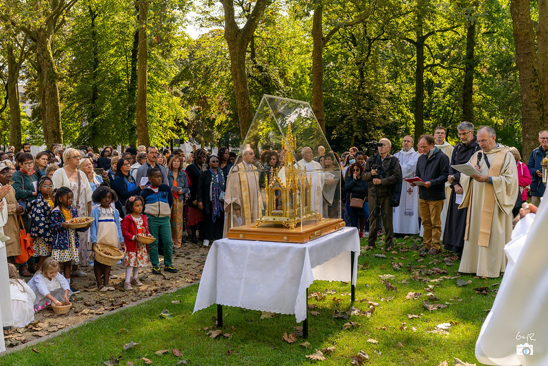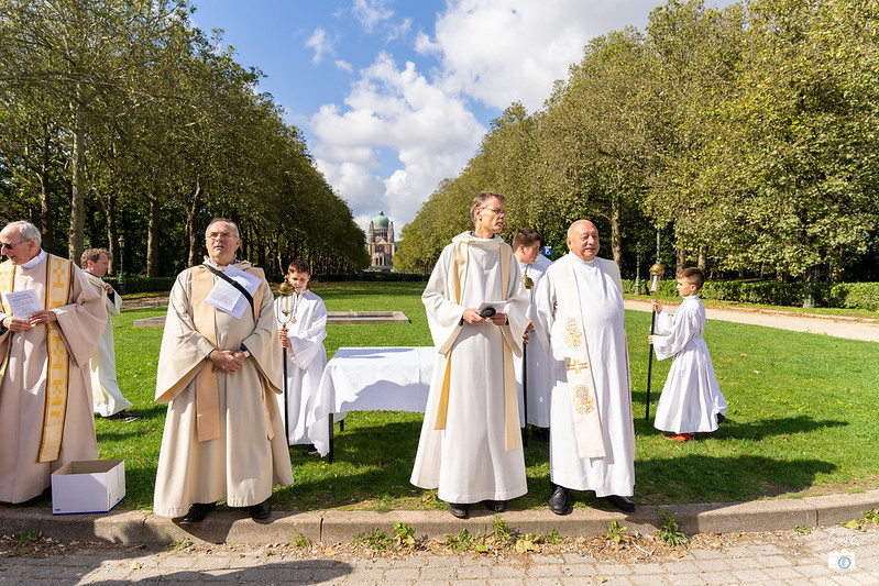Samedi 23 septembre, la procession chargée du reliquaire s’ébranlait depuis Simonis pour rejoindre la basilique à 14h : l’abbé Sébastien Dehorter, l’abbé Johan Dobbelaere et certains de leurs confères accompagnaient le flot des pèlerins.