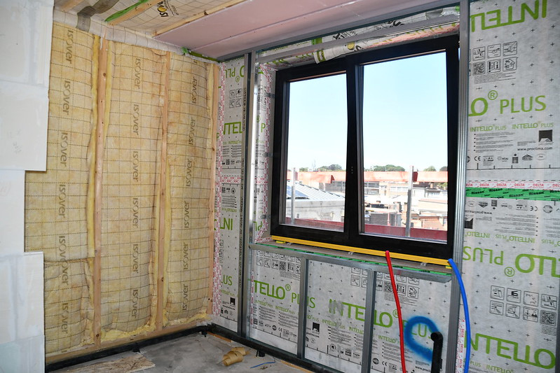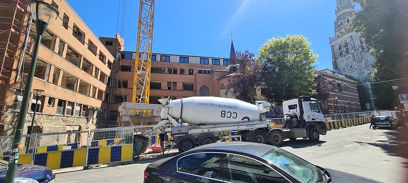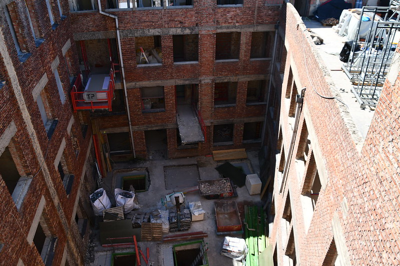 La dalle de l’espace ouvert sur la rue est en train d’être coulée, la cour intérieure a été complètement mise à nu, et, son sol à baies est en cours. A l’étage supérieur, le cloisonnement projeté a été réalisé, les châssis sont en cours de pose ainsi que l’isolation et les plafonds. Les 2 chaudières ainsi que le système de co-génération ont été installés à la cave tandis que les toits se sont couverts de panneaux solaires.