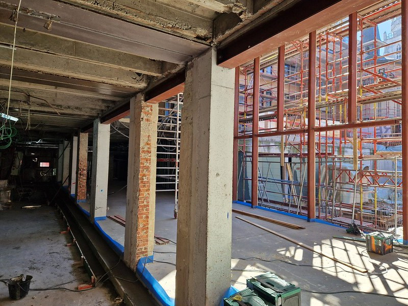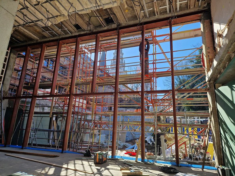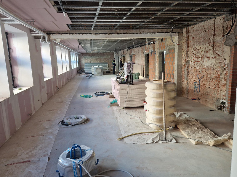 Les travaux avancent bien et atteignent une nouvelle étape marquante : l’ouverture de la façade côté futur restaurant vers l’espace vert, cœur du projet de village social, vient d’être pratiquée et préfigure l’aspect de cette cour qui remplace le jardin précédent. On voit se dessiner nettement les volumes définitifs des parties à usage collectif. Enfin les premiers logements notamment en étage sont en phase de parachèvement.