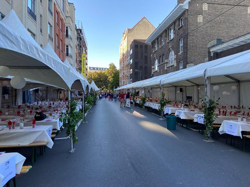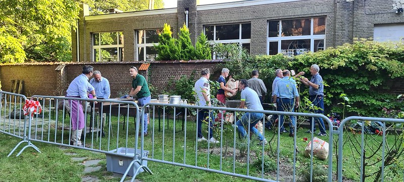A la suite de celle-ci, un apéritif était offert avant le traditionnel repas barbecue également en plein air sur la rue Joseph Stallaert. Celle-ci était bloquée à la circulation et les bus détournés. Les moins de 12 ans avaient un espace repas à part jouxtant les jeux en bois et non loin du château gonflable qui a connu un grand succès ; à l’issue du repas, un film leur était proposé.
