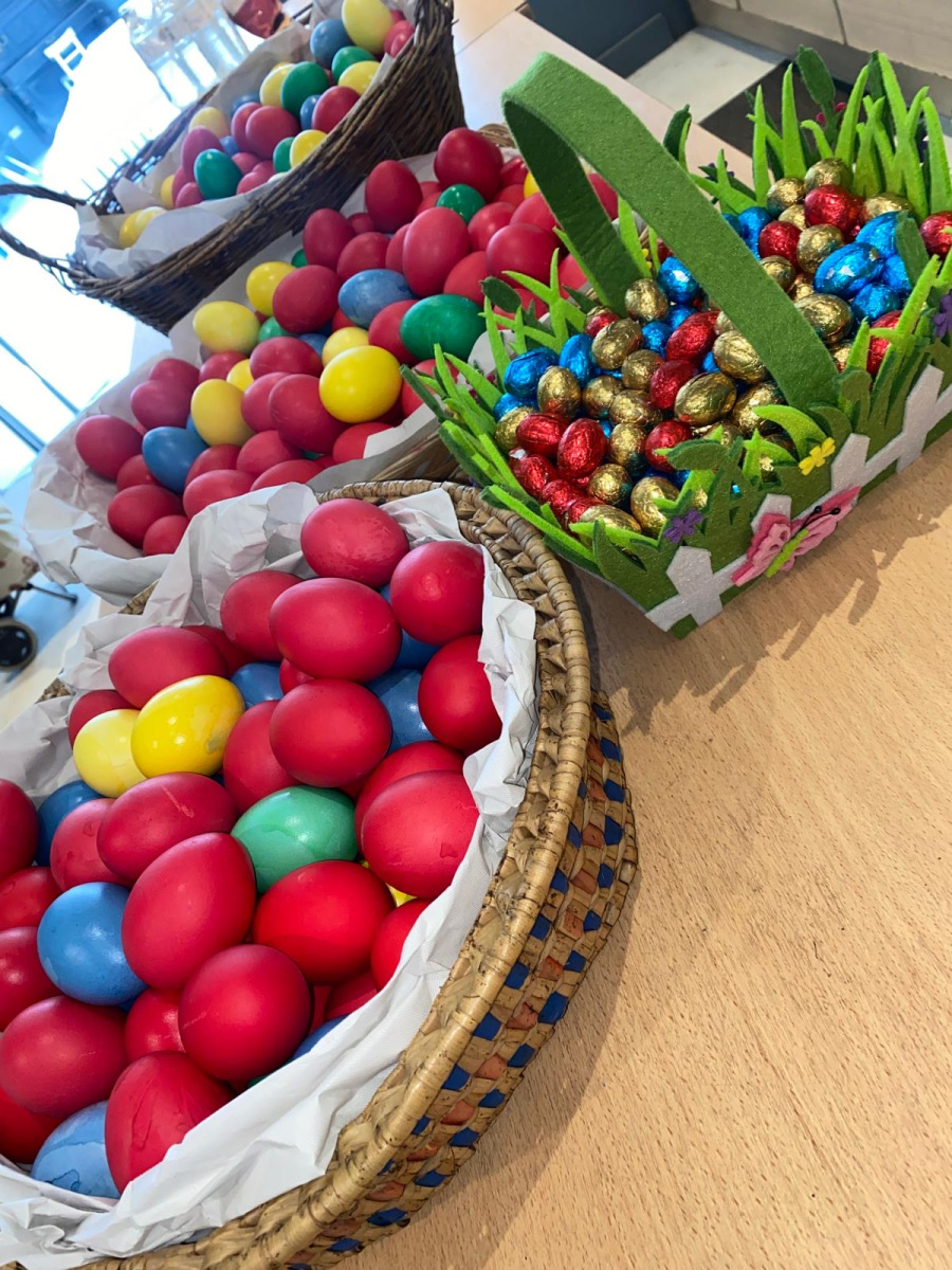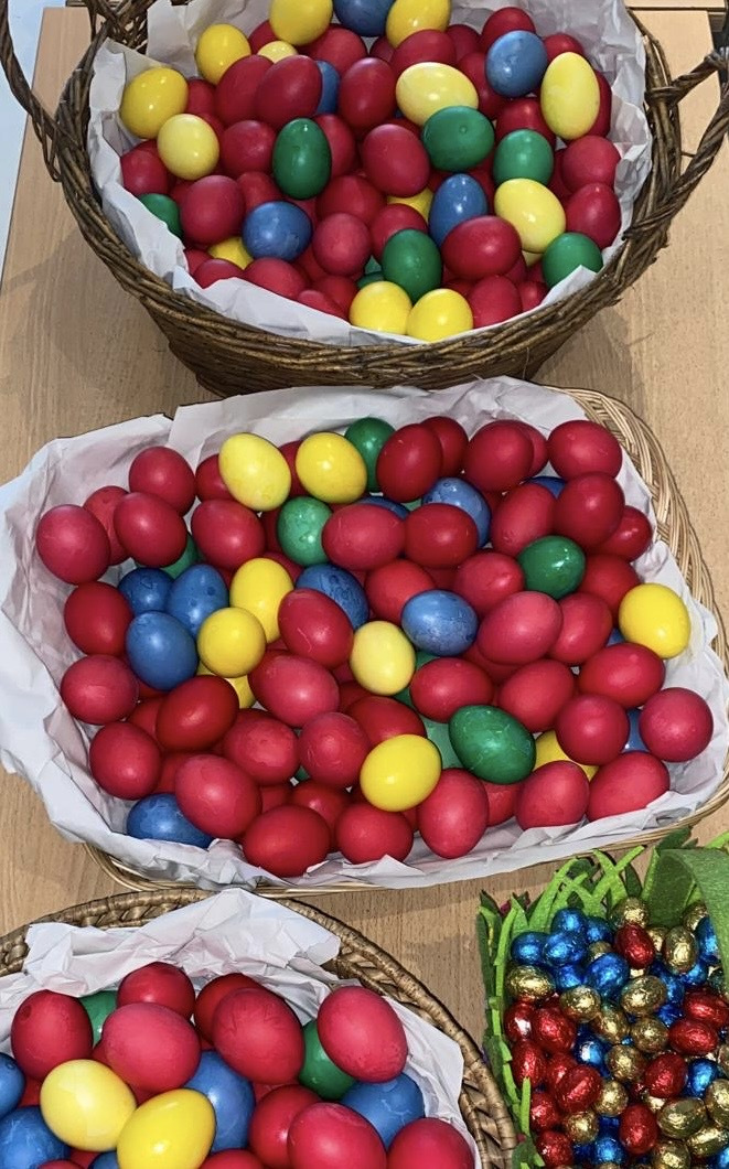 Comme activité du samedi, il y a la tradition de peindre des œufs, que nous distribuons le dimanche après la messe de Pâques.
