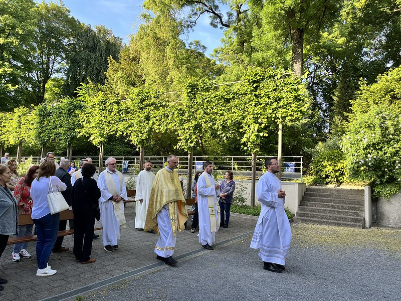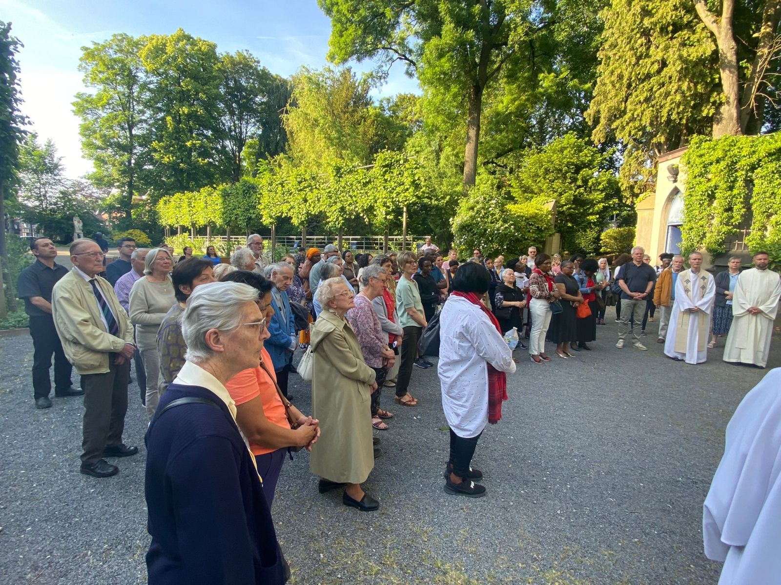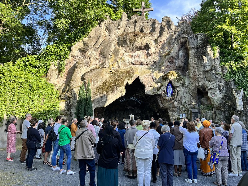 Après la messe l’Ave Maria a été récité devant la grotte en extérieur donc spontanément en une dizaine de langues, celles des communautés et personnes présentes. On notera la présence des fidèles albanais, ukrainiens, italiens, polonais et brésiliens ainsi qu’une sœur portugaise, une assistante pastorale hispanophone et un prêtre anglophone du Nigeria. C’était une belle image de l’Église de Bruxelles, dans la richesse de sa diversité.