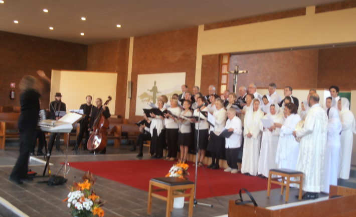Dimanche 15 octobre deux chorales et un orchestre présentaient un très beau concert interreligieux à l’église Notre Dame du Perpétuel Secours à Watermael-Boitsfort. La chorale paroissiale Ste Cecilia d’Alsemberg, le groupe musulman soufi AISA de Bruxelles et les musiciens juifs KRUPNIK puisaient des mélodies de leurs traditions spirituelles respectives. A certains moment l’interaction musicale montrait clairement le lien entre les trois religions, soulignée par un chant final commun pour la paix. L’après-midi était proposé par une série d’associations catholiques, protestantes, juives et musulmanes, néerlandophones et francophones, coordonné par le Pôle Expertise Dialogue Interreligieux de l’Eglise de Bruxelles. Chaque année un autre lieu de culte se présente comme ’hôte’, toutes les propositions pour l’édition 2018 sont les bienvenues.