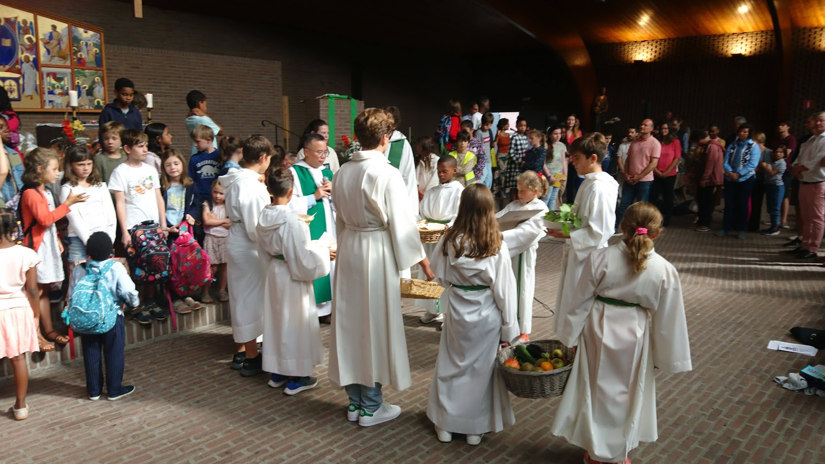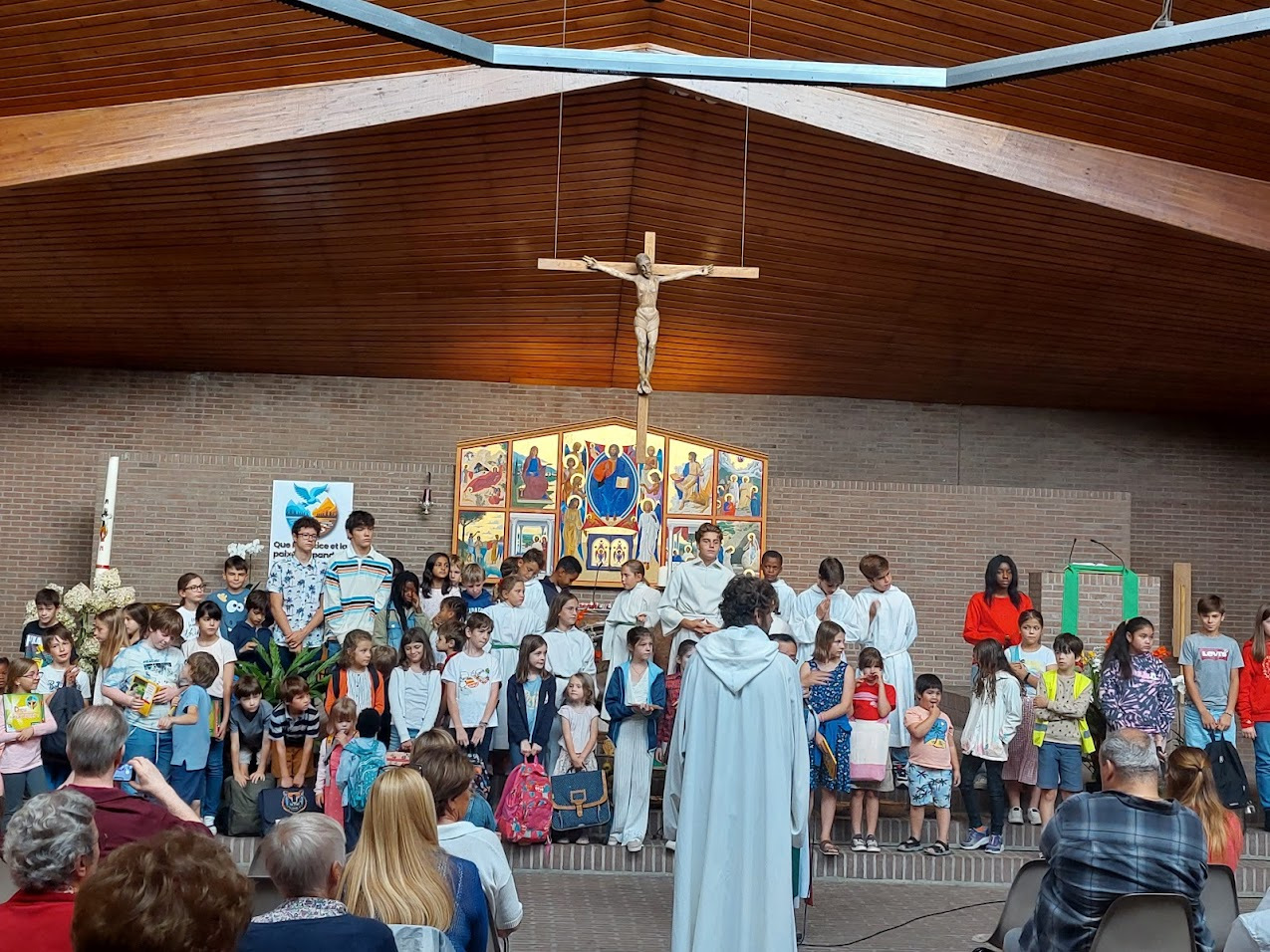C’est ainsi que lors de la procession de l’offertoire, des pains azymes fabriqués la veille par des jeunes, ainsi que des fruits et des légumes ont été portés à l’autel. La messe, chantante et joyeuse, s’est achevée par la bénédiction des cartables, en signe du travail que nos jeunes et enseignants offrent au Seigneur en ce début d’année.