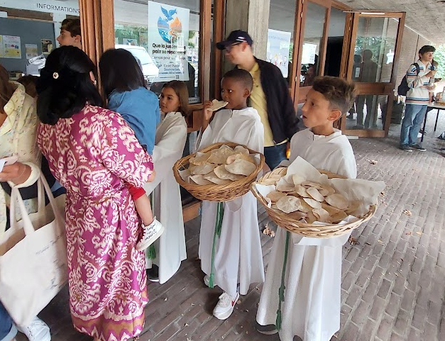 N’oublions les pains azymes cuits par nos plus jeunes la veille. Bénis solennellement par l’abbé Antonin, ils furent distribués à la sortie de l’église et ont accompagné le traditionnel drink des Matinées de la Foi.