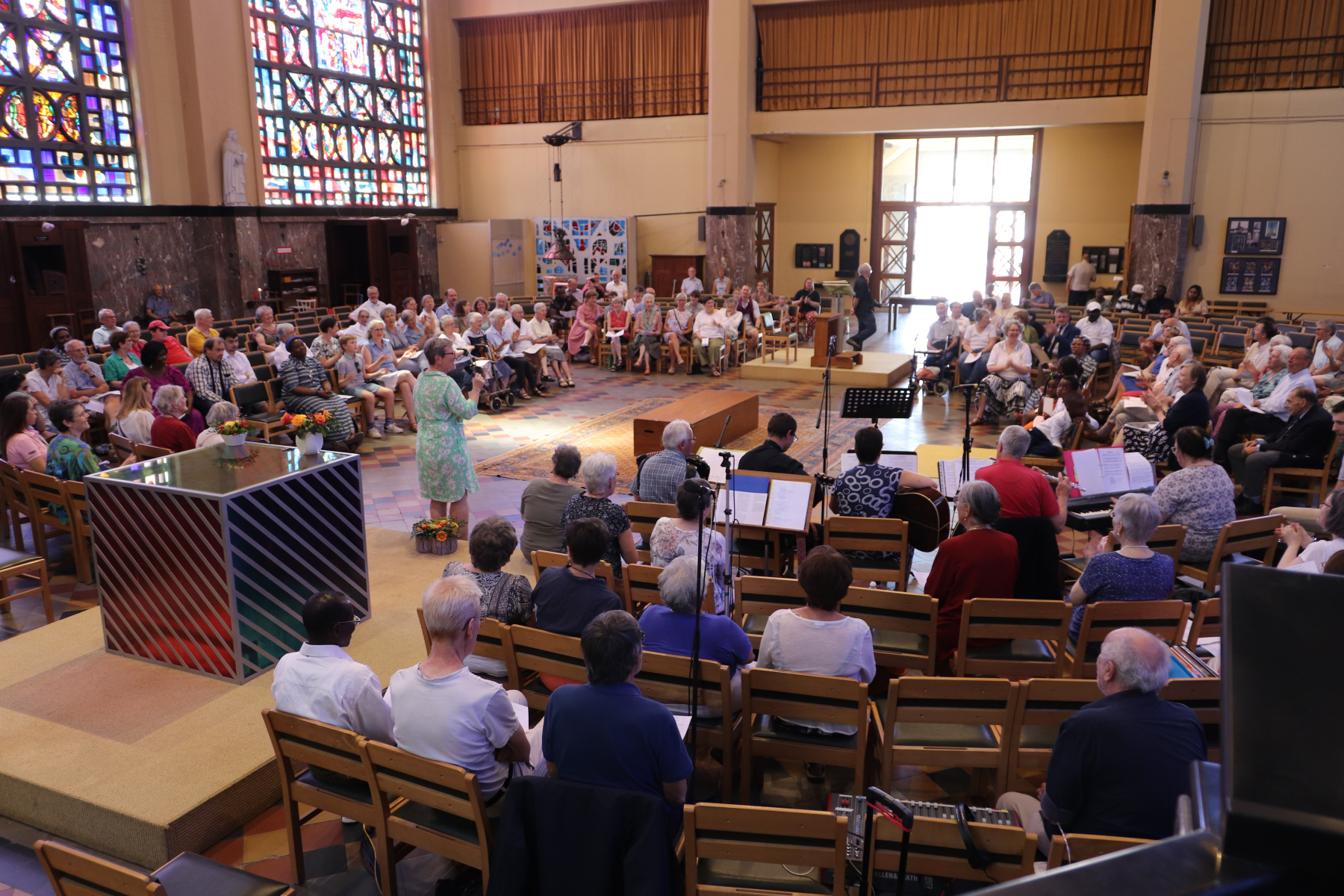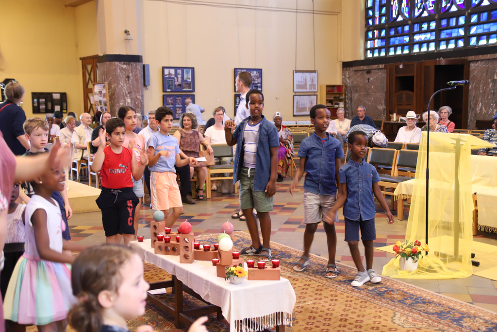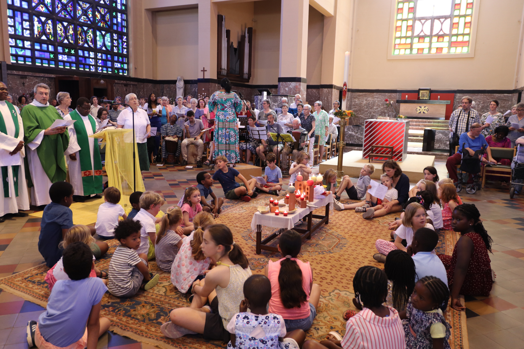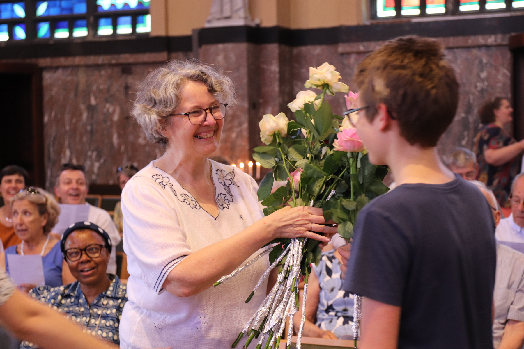 Ce dimanche 25 juin, la célébration eucharistique en l’honneur de la sœur Anne Peyremorte a eu lieu à l’UP Kerkebeek. A occasion de cette célébration de fête, la célébration à été présidé par le Doyen Éric Vancraeynest. Tout le monde a payé de sa personne. Du Frère Roger, qui a joué de l’orgue, aux enfants, qui ont animé l’Offertoire, en passant par ceux et celles qui ont porté la prière universelle et appelé la bénédiction de Dieu sur le quintet à venir.L’abbé Salomon, a audacieusement entonné la ‘grande doxologie’, à la Kerkophonique, dirigée dans une magnifique unité par Christiane, Hedwig, Cécile et Godelive.