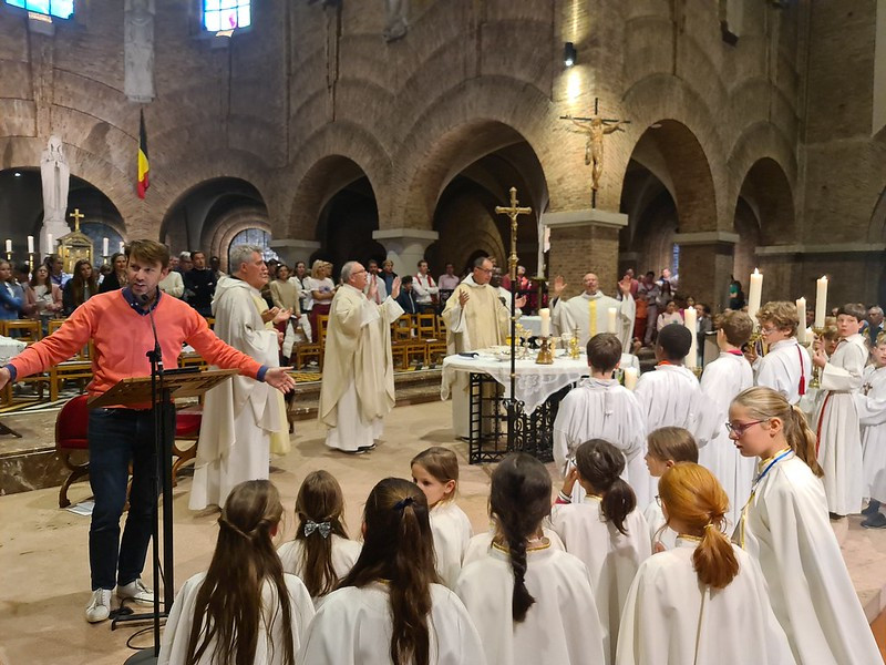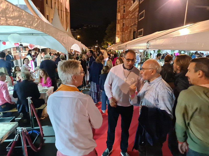 La fête se poursuivait par un apéritif dans la rue Joseph Stallaert, fermée pour l’occasion à la circulation. De part et d’autre de celle-ci avaient été dressés chapiteaux et tables pour un grand repas barbecue qui réunissait 1600 participants adultes et 1200 enfants. Le service était assuré par le groupe St-Jean des Scouts d’Europe rattaché à cette UP. L’animation était assurée au piano par Augustin Izoard qui alternait chants de louange et grands succès du répertoire pop, accompagné de Marin, son frère, à la guitare basse.