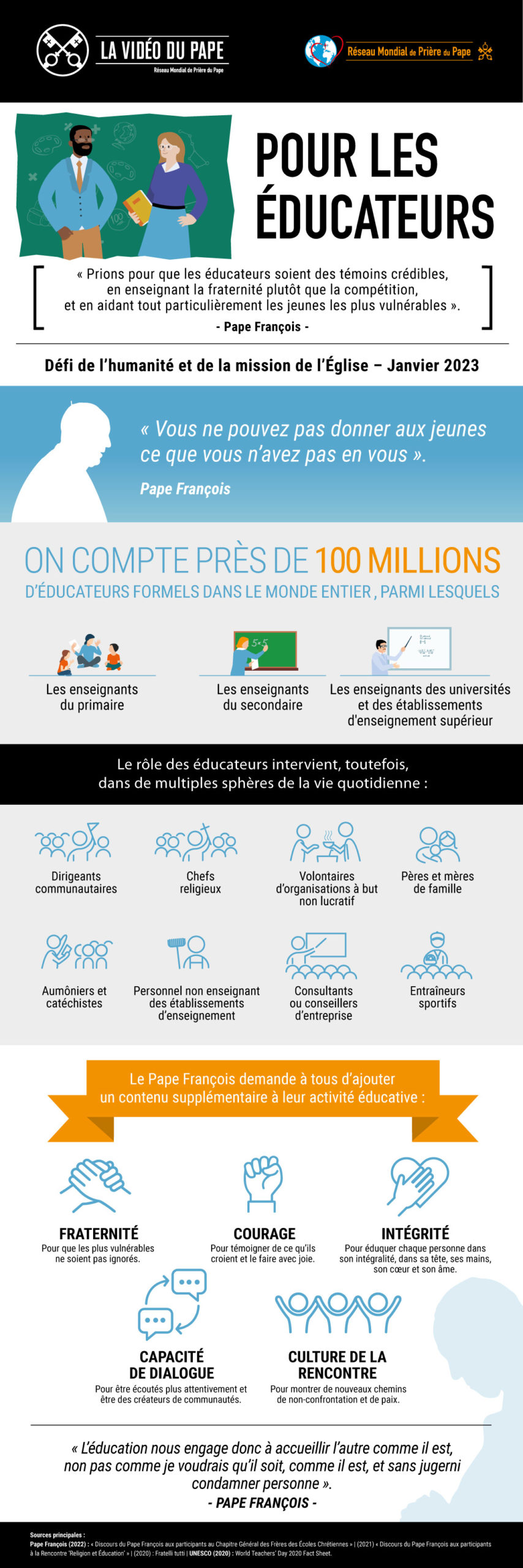 Prions pour que les éducateurs soient des témoins crédibles, en enseignant la fraternité plutôt que la compétition, et en aidant tout particulièrement les jeunes les plus vulnérables.