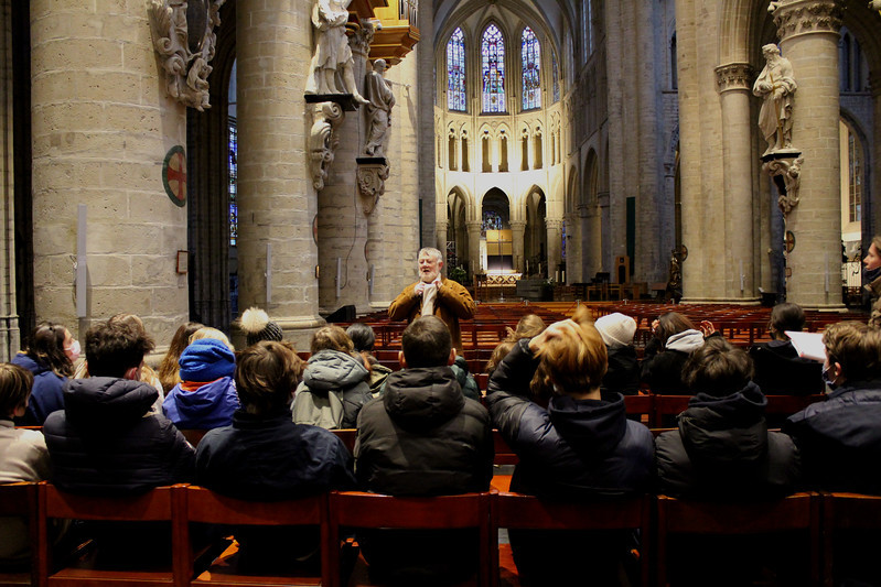 Ce lundi matin 31 janvier, mgr s’est prêté avec enthousiasme d’accueillir et guider deux groupes d’une vingtaine d’élèves de 4ème secondaire de l’Institut Saint-André à Ixelles : pour ces jeunes, une visite guidée inhabituelle de la cathédrale dispensée avec humour et mêlant histoire et éléments de foi.